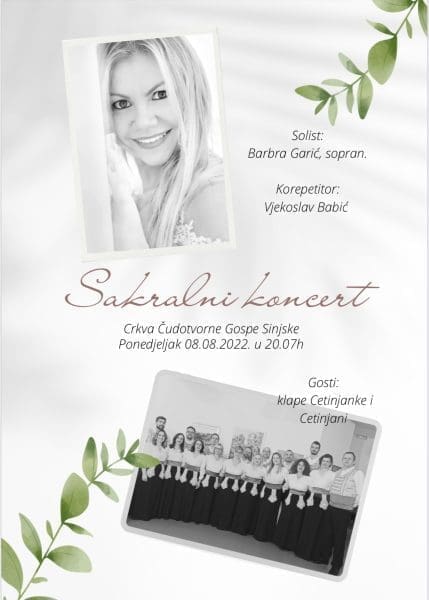 Sinjani, kao i njihovi mnogobrojni turisti imaju jedinstvenu priliku uoči blagdana Velike Gospe, točnije 08.kolovoza u 20:00 uživati u divni zvucima klasične glazbe u izvedbi sopranistice Barbare Garić uz klavirsku pratnju pijanista i dirigenta Vjekoslava Babića. Umjetnici su u ovom ciklusu izabrali djela vrhunskih klasičnih autora od kojih izdvajamo W. A. Mozarta, G. F. Handel, F. P. Schubert, G.R.Caccini, Ch.Gounod,…