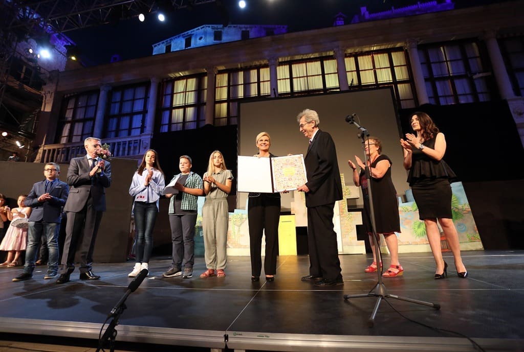 Predsjednica, ujedno i šibenska nevista, uručila je Priznanje Republike Hrvatske, a primio ga je Ante Pulić, direktor festivala u njegovim najtežim danima, danima Domovinskog rata. 'Ova je nagrada došla iznenada, ali ja sam zahvalan, zahvalan svima onima koji su ga pomogli stvarati kroz rat. Ova grad je zaslužan što je festival održan, mnogi znani i neznani koji su pomogli održati festival', kazao je Pulić.