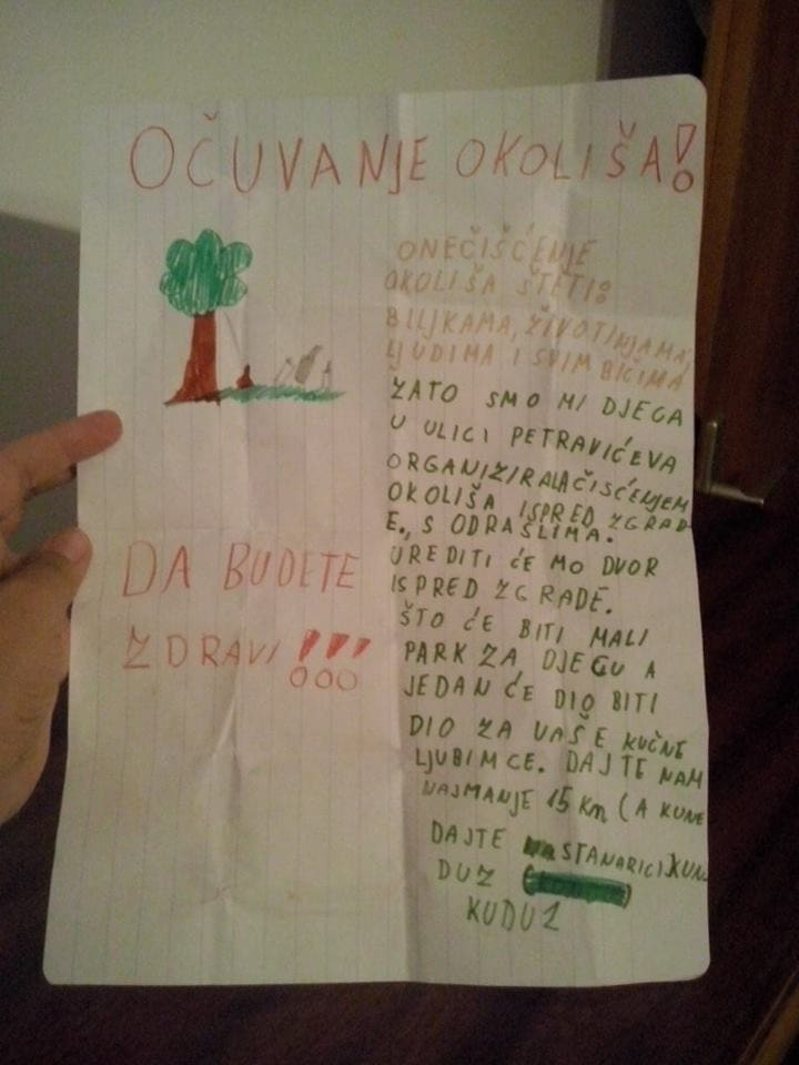 „Jučer se na Brdima, u gradu Splitu pokrenulo nešto stvarno prekrasno. Djeca iz ulice su zajedno sa mnom i mojom obitelji odlučila da im je dosta prljavog okoliša, prepunog smeća, opušaka, boca i ostalog i krenuli smo skupljati smeće. Ta djeca se svaki dan igraju na parkingu i oko zgrada jer nemaju izbora. Nemaju svoj kutak, mjesto gdje bi u miru mogli razvijati svoju kreativnost, bez straha da će im lopta udariti neko auto. Zato smo odlučni u svojoj namjeri da krenemo i korak dalje. Ne samo da želimo srediti okoliš oko zgrade, već želimo i da se gradilište u ulici, koje stoji zapušteno preko 30 godina, sredi i napravi park za djecu, ugodno mjesto gdje će se moći igrati, održavati radionice, humanitarne akcije, gdje će i roditelji moći doći sjesti i uživati. Ja sam kao mala provela svoje djetinjstvo na ovom gradilištu i parkingu i zato želim ovoj djeci nešto bolje. Ova djeca, i manji i malo veći, tako su kreativni, pametni i sposobni. Neka vide da nam je stalo do njih. Omogućimo im da razvijaju te svoje kvalitete. Pročitajte ovo pismo koje su sastavili i poduzmimo nešto zajedno za njih. Za našu budućnost!”