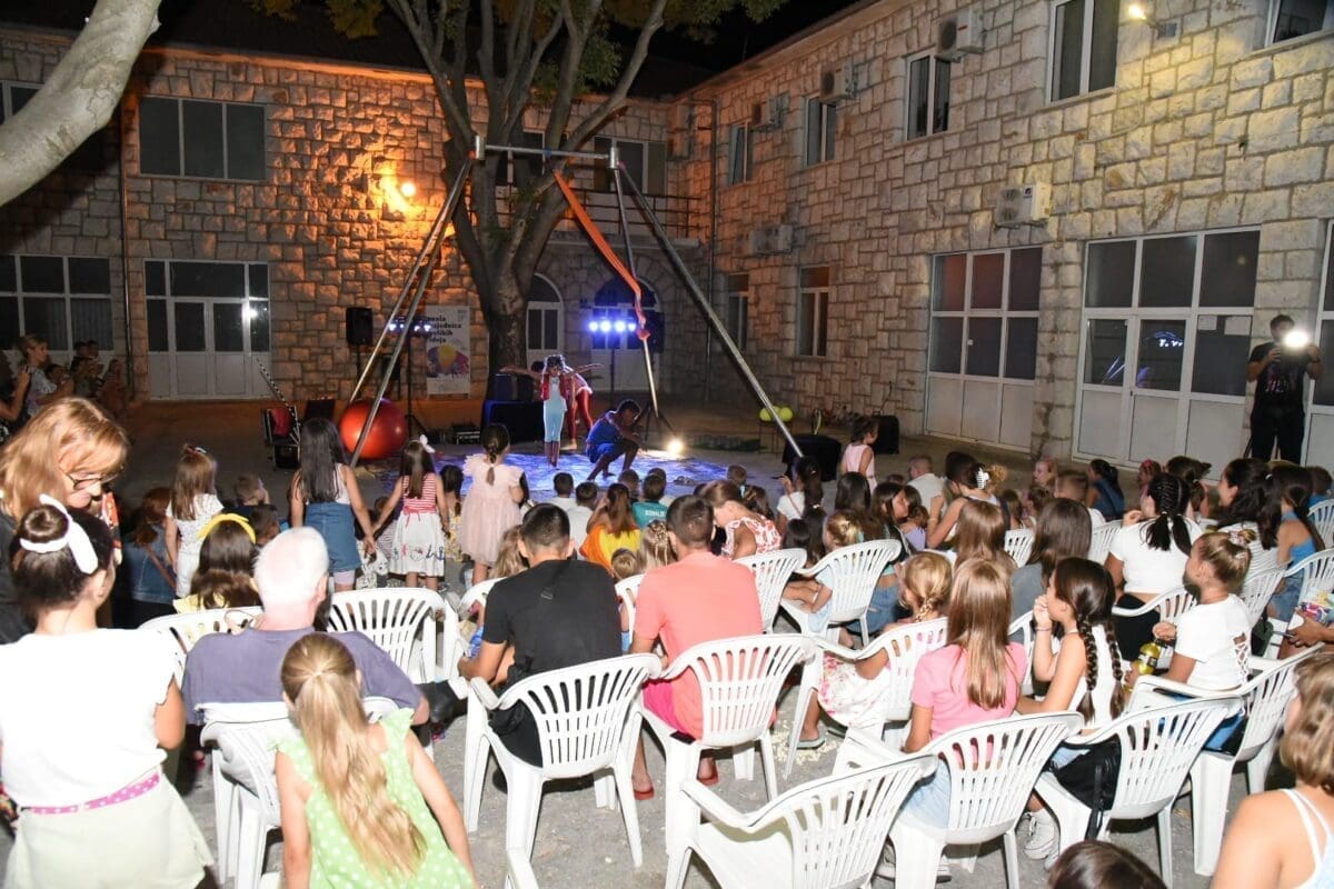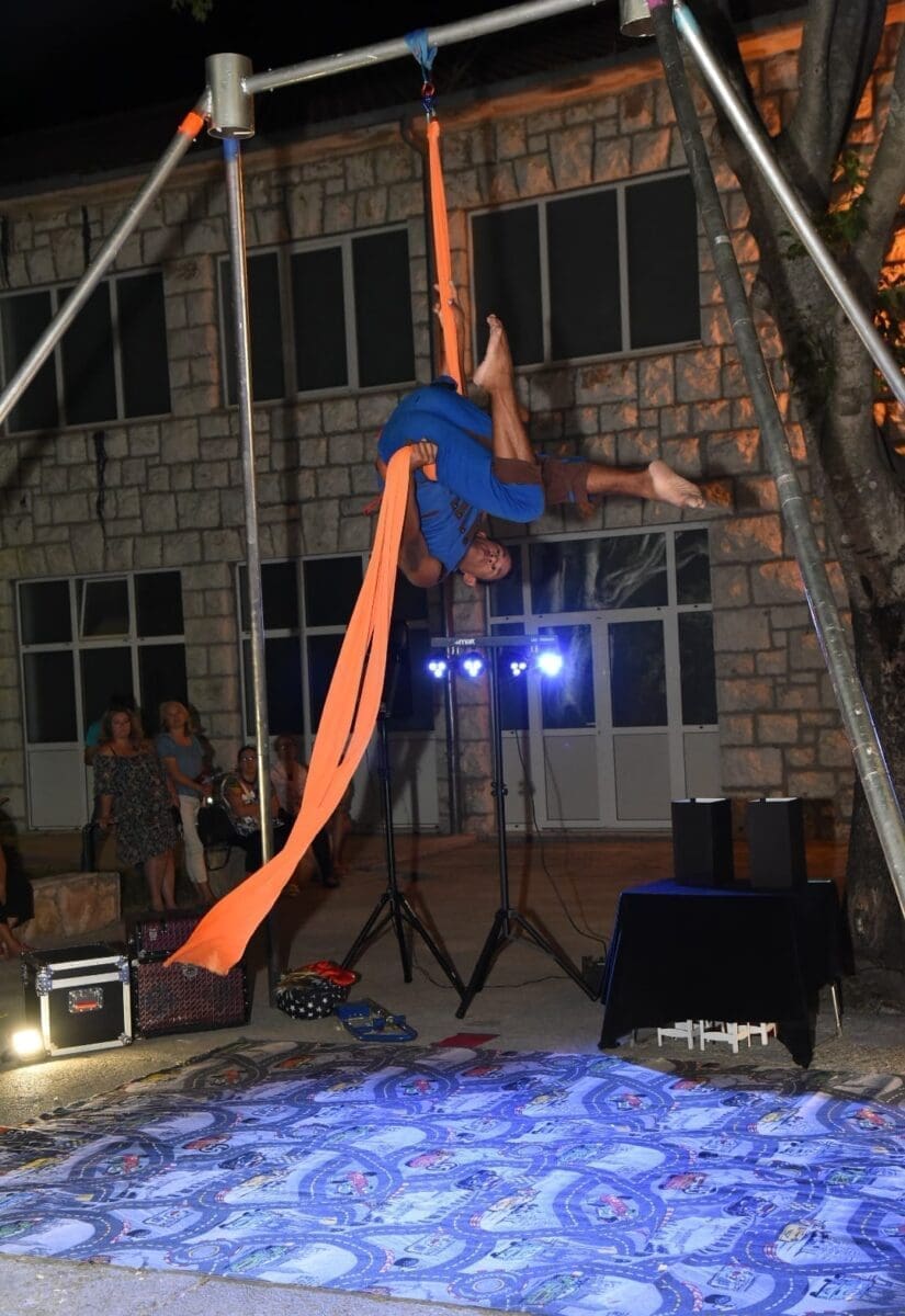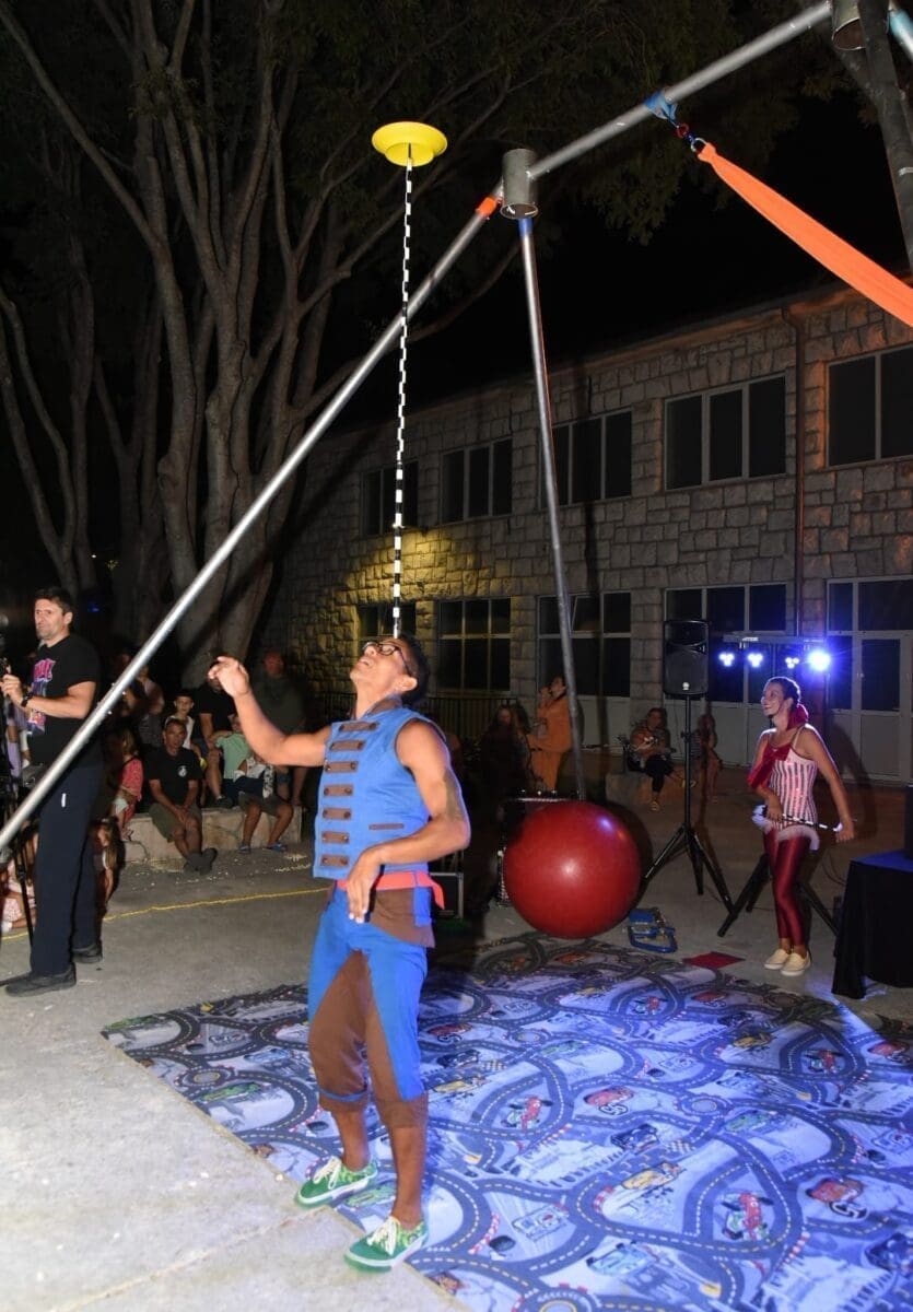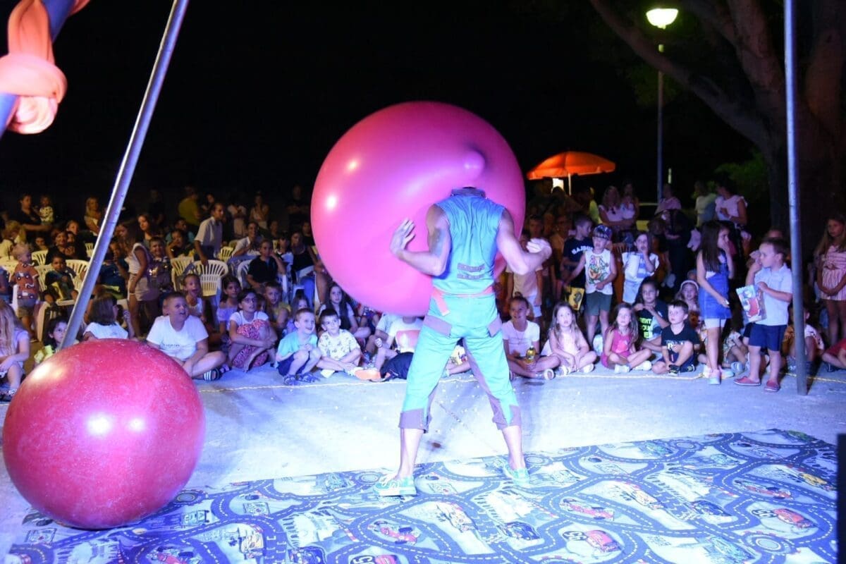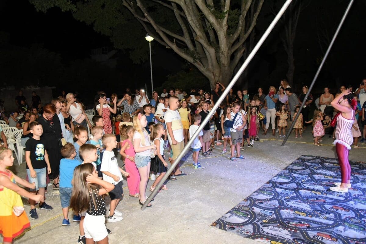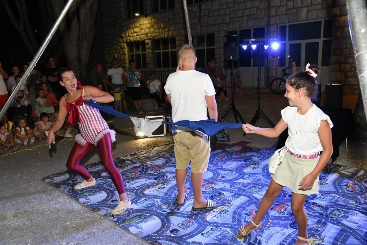 Dva animatora s dugogodišnjim iskustvom u animaciji vodila su sinoć djecu kroz različite aktivnosti – cirkusku predstavu s trikovima u kojima su sudjelovala i okupljena djeca. Bilo je tu i ludih akrobacija, trikova s vatrom, plesa na svili i igre. Već od prve minute zaokupili su dječju pažnju koja su znatiželjno i s oduševljenjem pratila svaki pokret animatora.