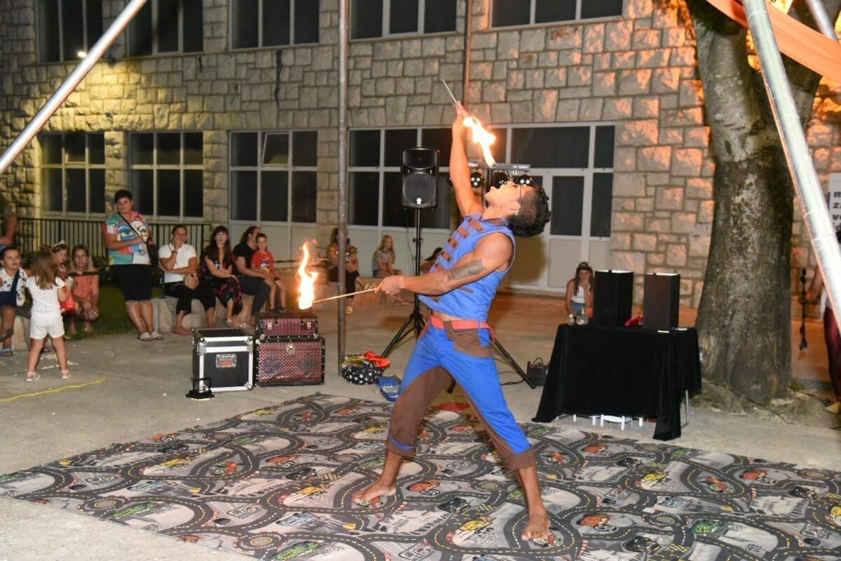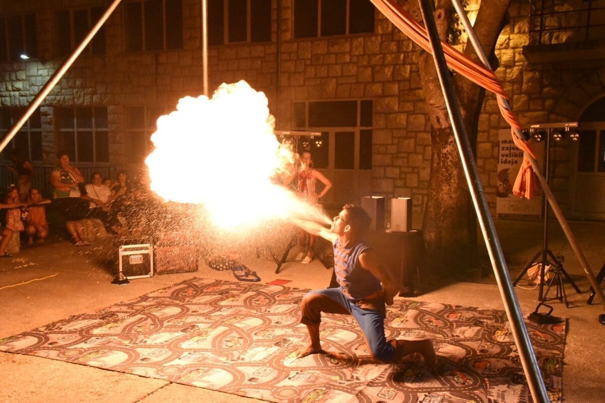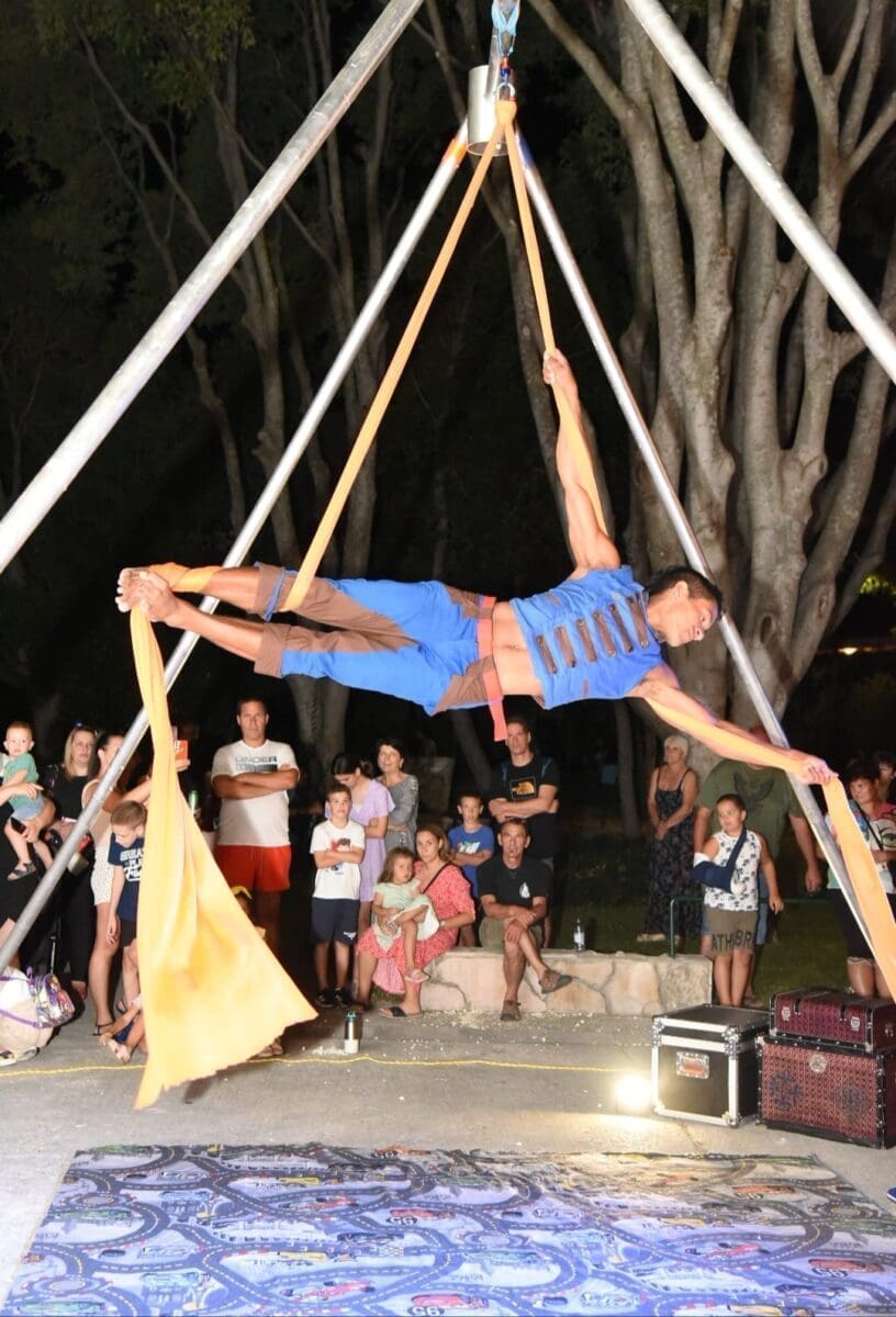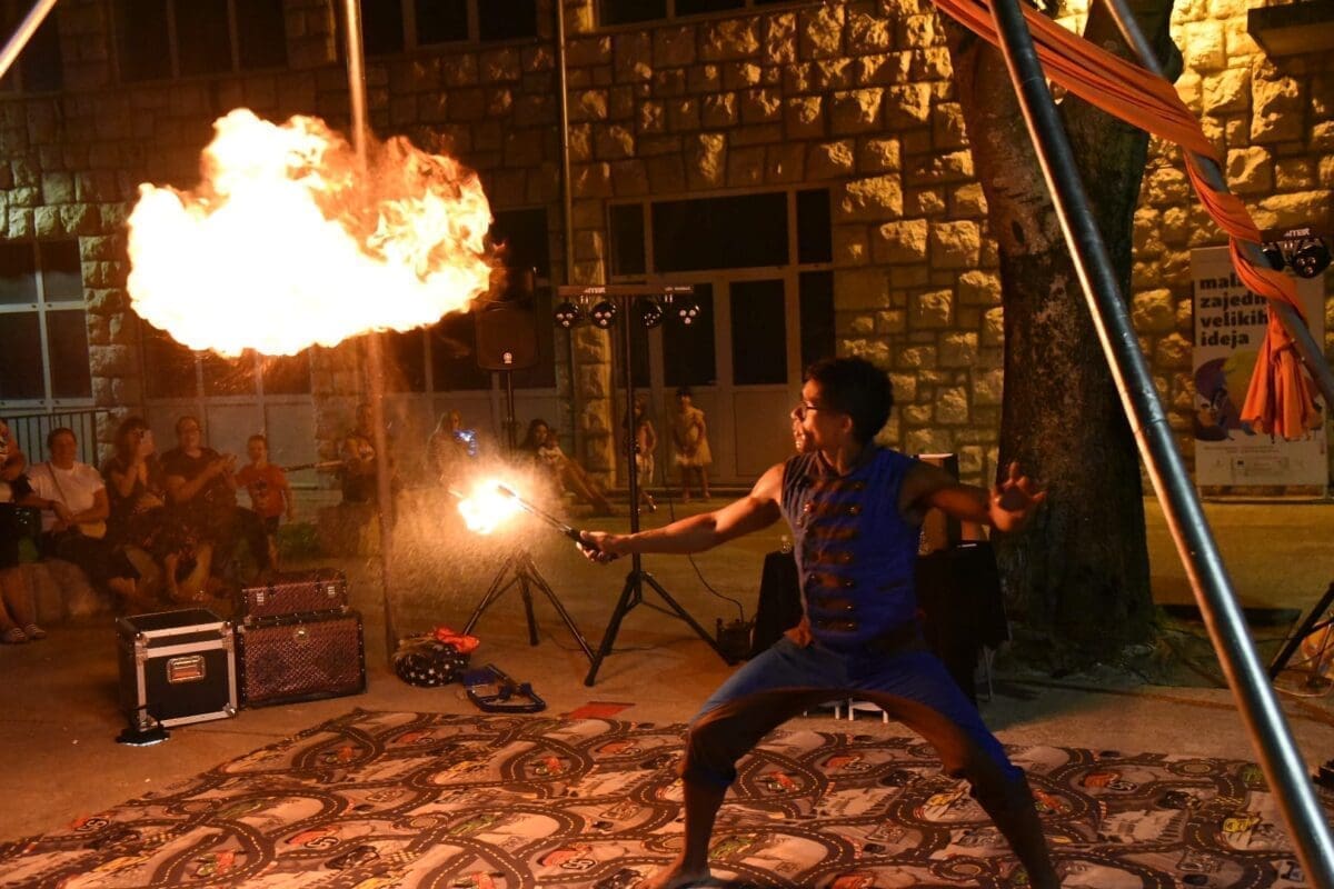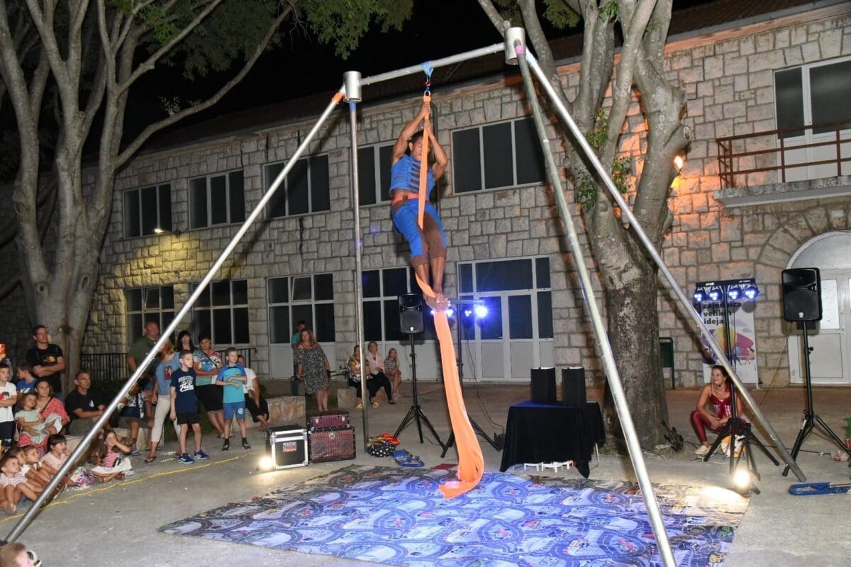 Dva animatora s dugogodišnjim iskustvom u animaciji vodila su sinoć djecu kroz različite aktivnosti – cirkusku predstavu s trikovima u kojima su sudjelovala i okupljena djeca. Bilo je tu i ludih akrobacija, trikova s vatrom, plesa na svili i igre. Već od prve minute zaokupili su dječju pažnju koja su znatiželjno i s oduševljenjem pratila svaki pokret animatora.