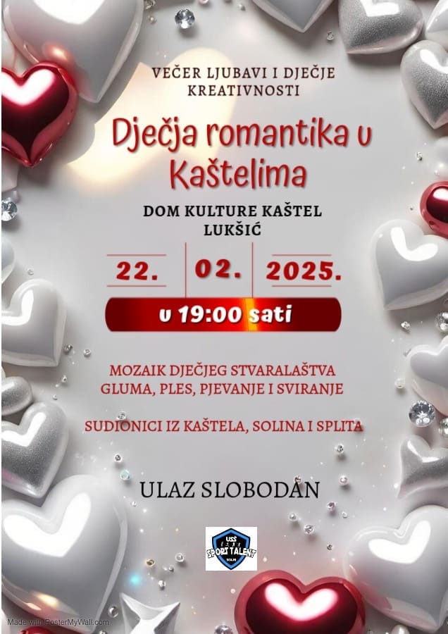 U organizaciji Univerzalne sportske škole Sport talent Solin u Domu kulture u Kaštel Lukšiću 22.02.2025. godine u 19:00 sati održati će se dječja manifestacija u obliku mozaika dječjeg stvaralaštva povodom Dana zaljubljenih. Sudionici manifestacije su, osim djece baletne plesne skupine Movement kao dijela Univerzalne sportske škole Sport talent Solin, djeca članovi udruga koje djeluju na području Kaštela, Solina i Splita.