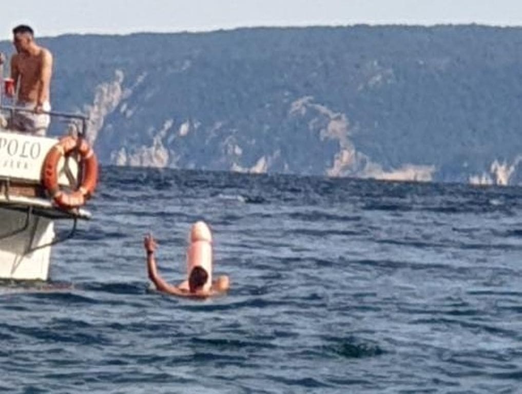 Na fotografiji se može vidjeti kako se jedan mladić kupa zabavljajući se s luftićem u obliku penisa.