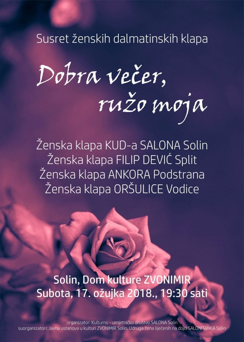 Kulturno-umjetničko društvo Salona Solin u suradnji s Javnom ustanovom u kulturi Zvonimir Solin i Udrugom žena liječenih na dojci Salonitanka Solin priređuje susret ženskih klapa pod nazivom "Dobra večer, ružo moja".