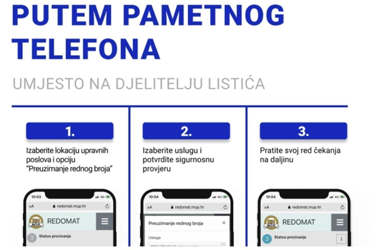 Program redomat.mup.hr omogućava fizičko preuzimanje listića s brojem, ima opciju provjere preuzetog listića te opciju rezervacije termina.