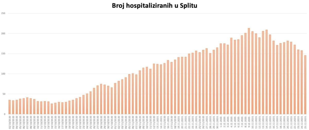 Prema grafovima koje je objavio vidi se da je broj hospitaliziranih Covid-pozitivnih pacijenata u cijeloj Hrvatskoj u padu. Primjerice, u Splitu je na vrhuncu bilo preko 200 hospitaliziranih, a sada je broj pao ispod 150.