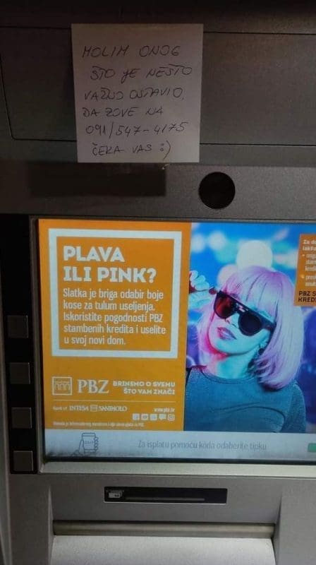 Naime, na Facebook grupi "Izgubljeno/nađeno" objavljena je slika PBZ bankomata u Gunudulićevoj ulici u Splitu na kojem je ostavljena cedulja s porukom.