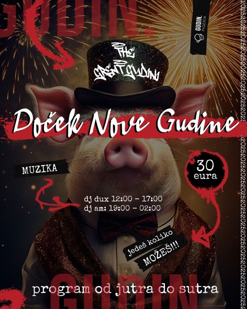 Večernji dio, pod nazivom "Doček Nove Gudine", počinje u 19 sati, kada DJ AM preuzima kontrolu nad atmosferom i vodi goste do odbrojavanja. Za samo 30 €, posjetitelji mogu uživati u konceptu "jedi koliko možeš", s naglaskom na praseće delicije, dok ih u ponoć čeka čaša šampanjca. Piće će biti dostupno po posebnim cijenama kako bi se nazdravilo u pravom splitskom stilu.