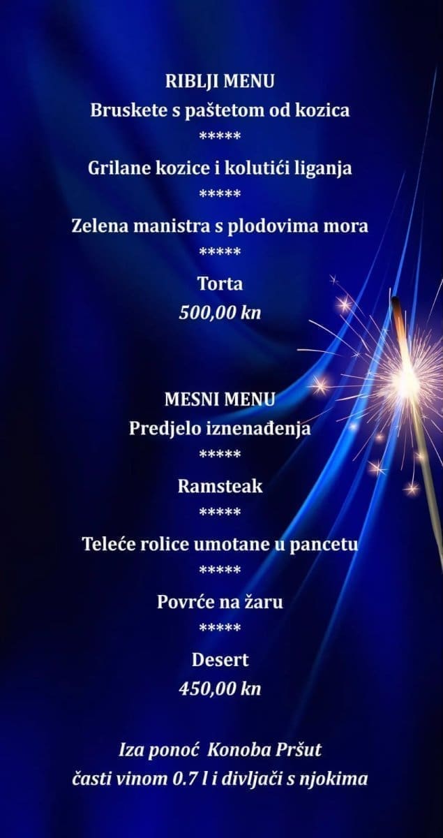 Nezaobilazni šampanjac teći će u ponoć, a iza ponoći Konoba Pršut časti vinom 0,7 l i divljač s njokima.