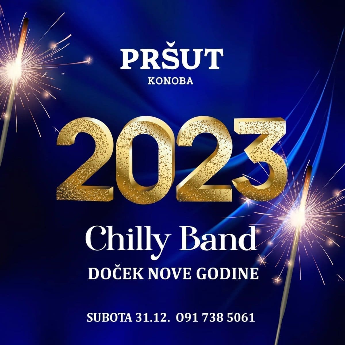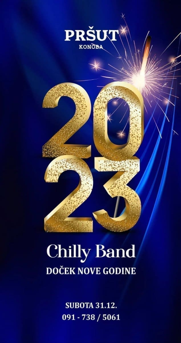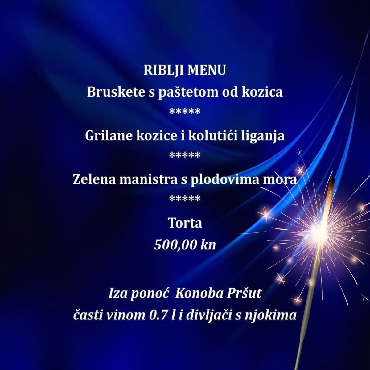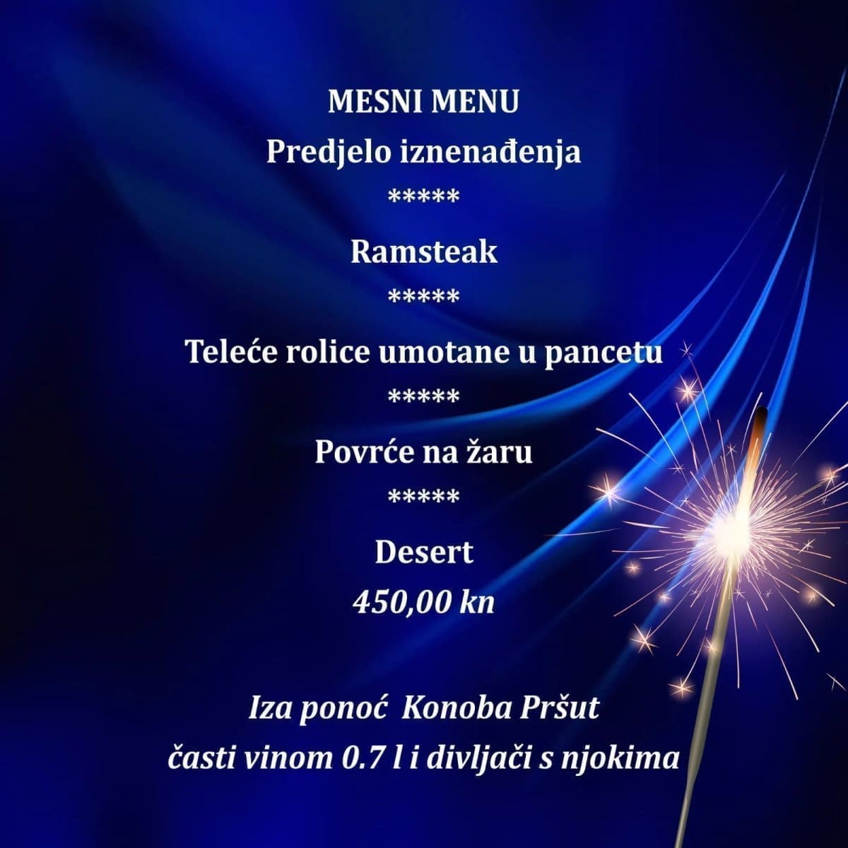 Nezaobilazni šampanjac teći će u ponoć, a iza ponoći Konoba Pršut časti vinom 0,7 l i divljač s njokima.