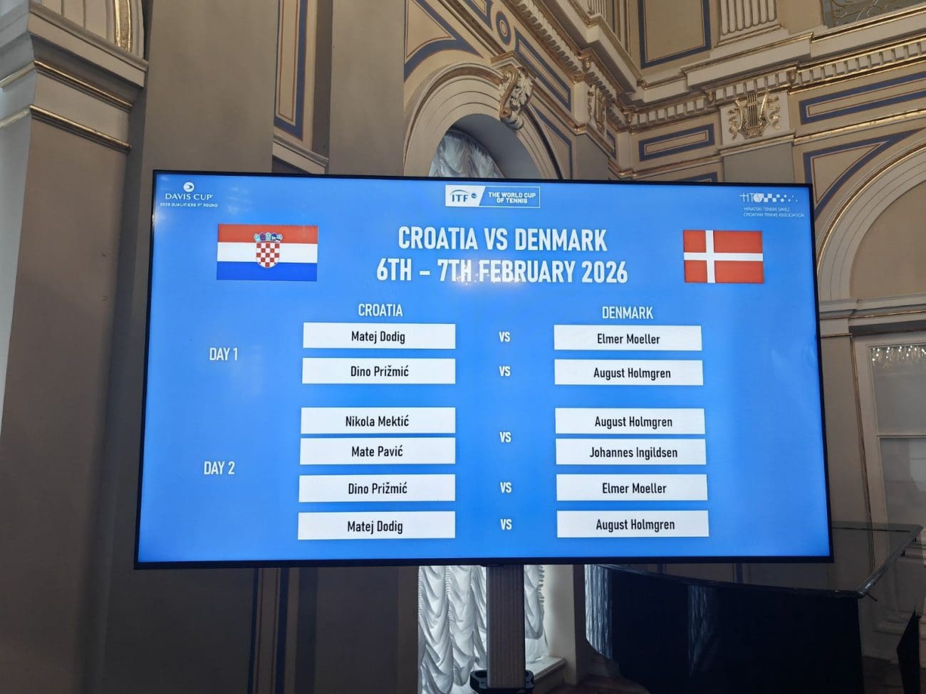 U varaždinskom Hrvatskom narodnom kazalištu obavljen je ždrijeb dvoboja 1. kola teniskog Davis Cupa Hrvatska-Danska. U petak će u 16 sati u Areni Varaždin igrati Matej Dodig i Elmer Møller, a nakon njih Dino Prižmić i August Holmgren.