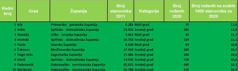 Gleda li se samo broj rođenih beba, na prvom je mjestu Krk u kojemu je prošle godine rođeno 12,6 beba na 1.000 stanovnika, Solin je drugi sa 12 beba na 1.000 stanovnika, slijede Novalja i Imotski sa 11,7 i 11,1 beba, te Pazin, Čakovec, Dugo Selo, Omiš, Dubrovnik i Metković u kojima je rođeno preko 10,5 beba na svakih 1.000 stanovnika.