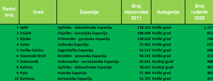 U apsolutnim brojkama prednjače, naravno, veliki gradovi. U Zagrebu, koji nikad iz očiglednih razloga ne uspoređujemo s ostalim gradovima, rođeno je tako 7.865 beba, Splitu 1.377, Osijeku 851, Rijeci 740, Zadru 672, Velikoj Gorici 600 i Slavonskom Brodu 473. U top 10 gradova s najviše rođene djece uspjeli su se ubaciti i Dubrovnik i Kaštela, kao gradovi srednje veličine, te još dva velika – Pula i Karlovac.
