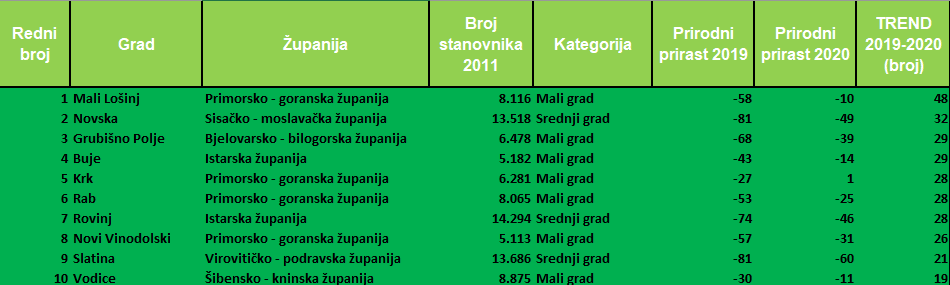 Smanjuje se, nažalost, i broj gradova koji bilježe pozitivan trend u odnosu na prethodnu godinu. Za razliku od podataka za 2019., kada je 67 gradova imalo bolji prirodni prirast nego godinu ranije, 2020. donijela je poboljšanje u tek 41 gradu. I dalje je to, naravno, u većini slučajeva minus, ali barem manji. Slika se najviše popravila u Malom Lošinju, koji je 2019. završio sa 58 više umrlih nego rođenih, da bi se ta brojka prošle godine smanjila na 10. Na drugom mjestu je Novska koja je 2019. imala 81 više umrlih nego rođenih, a prošle godine 49. Slijede Grubišno Polje i Buje, te Krk koji je prošle godine iz minusa prešao u plus – sa 21 više umrlih od rođenih na 1 više rođenih nego umrlih.