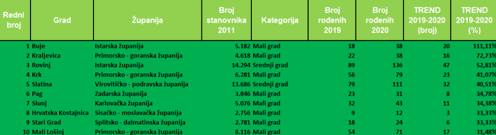 Kad je, pak, broj novorođenih beba u pitanju, u plusu su čak 63 grada, a njih pet je prošle godine imalo isti broj rođenih kao godinu ranije. Najveći rast rođenih beba lani je, tako, zabilježen u Bujama u kojima je rođeno 20 beba, u postotku čak 111 posto, više nego 2019. Na drugom je mjestu Kraljevica u kojoj je rođeno 72 posto djece više, u apsolutnim brojkama 16 beba, te Rovinj sa porastom od 52,81 posto (47 beba više nego 2019. godine). Krk i Slatina bilježe rast od preko 40 posto, a u top 10 su još Pag, Slunj, Hrvatska Kostajnica, Stari Grad i Mali Lošinj sa rastom većim od 31 posto. (M.P.D., V.H., P.L.)