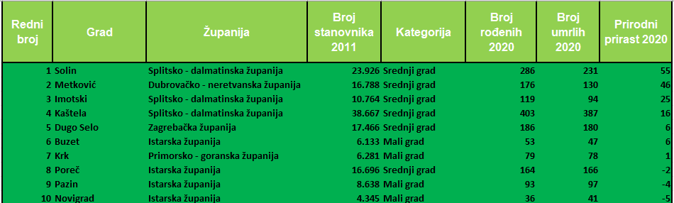 Najbolje i dalje stoje Solin i Metković u kojima je rođeno 55, odnosno 46 djece više nego što je bilo umrlih u protekloj godini. I Solin i Metković bilježe pozitivan trend i u odnosu na godinu ranije, pa je u Solinu lani rođeno sedmero, a u Metkoviću 18 beba više nego u 2019. godini. Tu je potom Imotski u kojemu je rođeno 25 djece više nego što je umrlih i 24 više nego godinu ranije, a u plusu su još Kaštela u kojima je rođeno 16 beba više nego što je umrlih i čak 28 više nego godinu ranije. Dugo Selo i Buzet imaju šest više rođenih nego umrlih, s tim da je u Dugom Selu lani rođeno čak 35 beba više nego 2019., a u Buzetu četiri. Zadnji pozitivni grad je Krk, u kojem je rođeno 79 djece, jedno više nego što je umrlih stanovnika grada, ali zato 23 više nego godinu ranije, pa je Krk među gradovima s najvećim postotnim povećanjem rasta broja beba i prvi broju rođenih beba na tisuću stanovnika, javlja Gradonačelnik.hr.