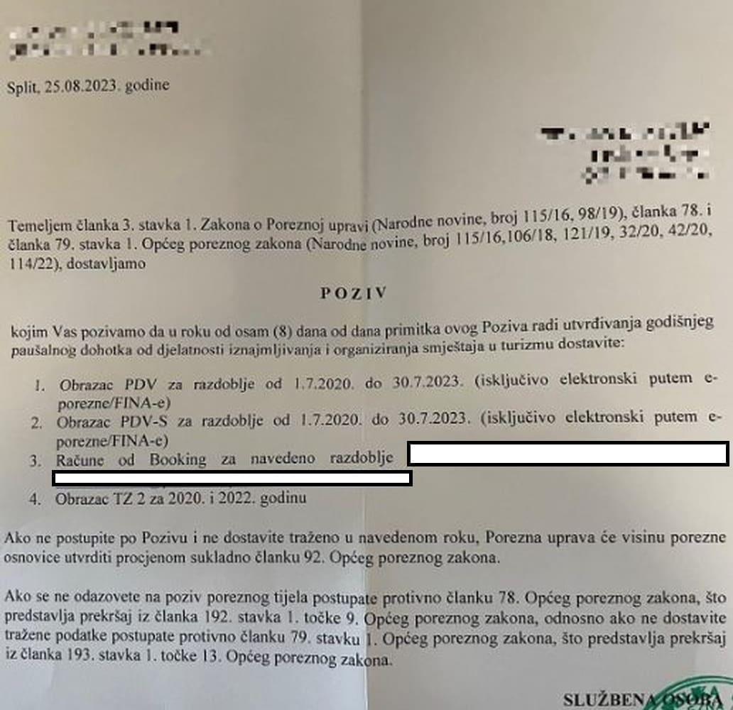 Marija dobiva poziv od Porezne uprave. Traže da dostavi PDV, PDV-S i račune od Bookinga. Ako ne dostavi traženo, Porezna će visinu porezne osnovice utvrditi procjenom sukladno članku 92. Općeg poreznog zakona.