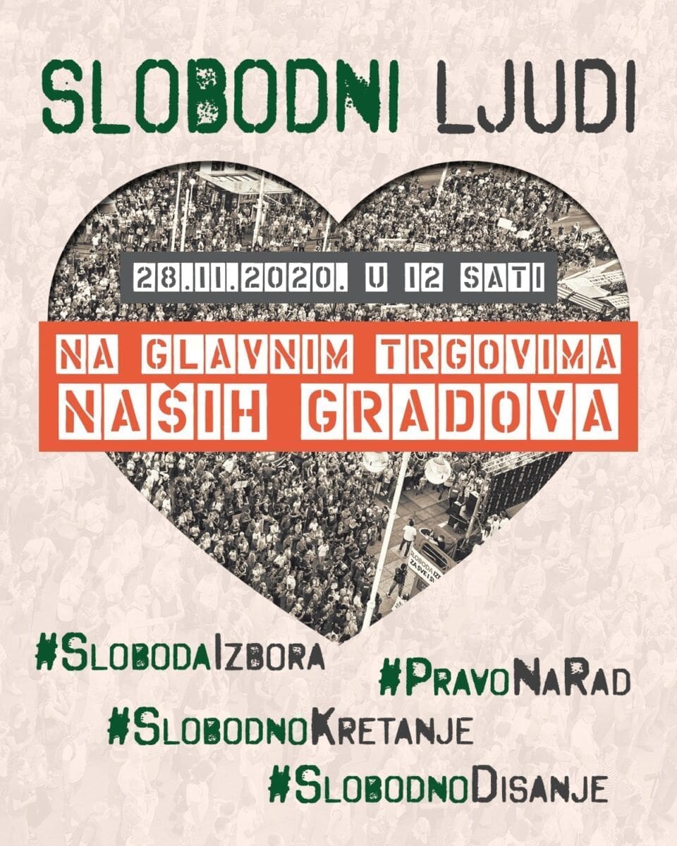 - Dragi slobodni ljudi! Ne dajmo svoje pravo na rad, slobodno kretanje, slobodno odlučivanje o sebi i svome tijelu, slobodno disanje! Svakim danom sve više produbljuju naše siromaštvo, svakim danom nas sve više lišavaju naših sloboda!