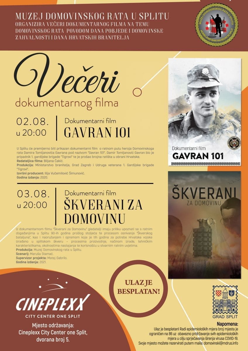 Muzej Domovinskog rata u Splitu povodom Dana pobjede i domovinske zahvalnosti i Dana hrvatskih branitelja organizira Večeri dokumentarnog filma na temu Domovinskog rata koje će se održati 2. i 3. kolovoza 2021. u 20.00 sati u Cineplexx-u u City Centru One u Splitu.
