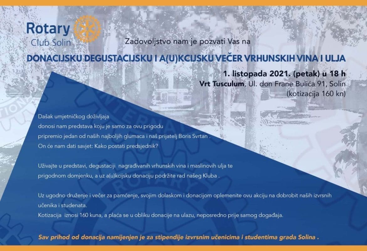 Rotary Club Solin organizira Donacijsku degustacijsku i a(u)kcijsku večer vrhunskih vina i ulja. Održat će se u petak 1. listopada u 18 sati u Vrtu Tusculum (Ulica don Frane Bulića 91, Solin). Kotizacija iznosi 160 kuna.