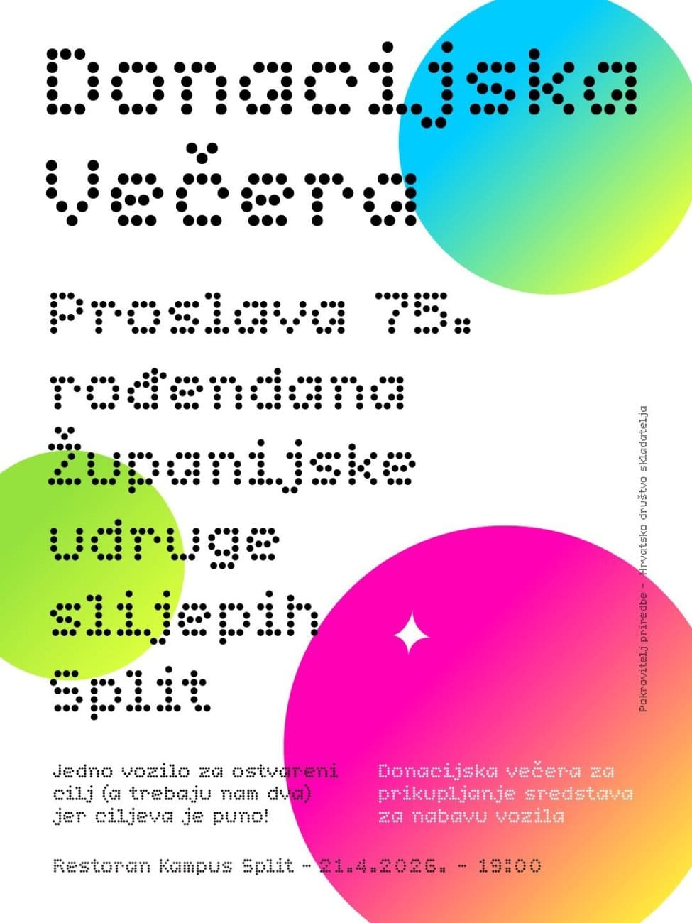 Županijska udruga slijepih Split ove godine obilježava veliki jubilej – 75 godina djelovanja, a tim povodom organizira donacijsku večeru koja će se održati u utorak, 21. travnja 2026. godine s početkom u 19 sati u Restoranu Kampus u Splitu.