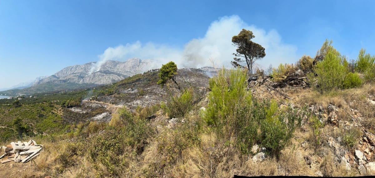 Požar je aktivan i širi se na sjevernom dijelu požarišta koji je ušao u PP Biokovo, a na požarište se spustila velika količina dima. Požarom je zahvaćena trava, nisko raslinje i borova šuma na površini oko 400 ha.