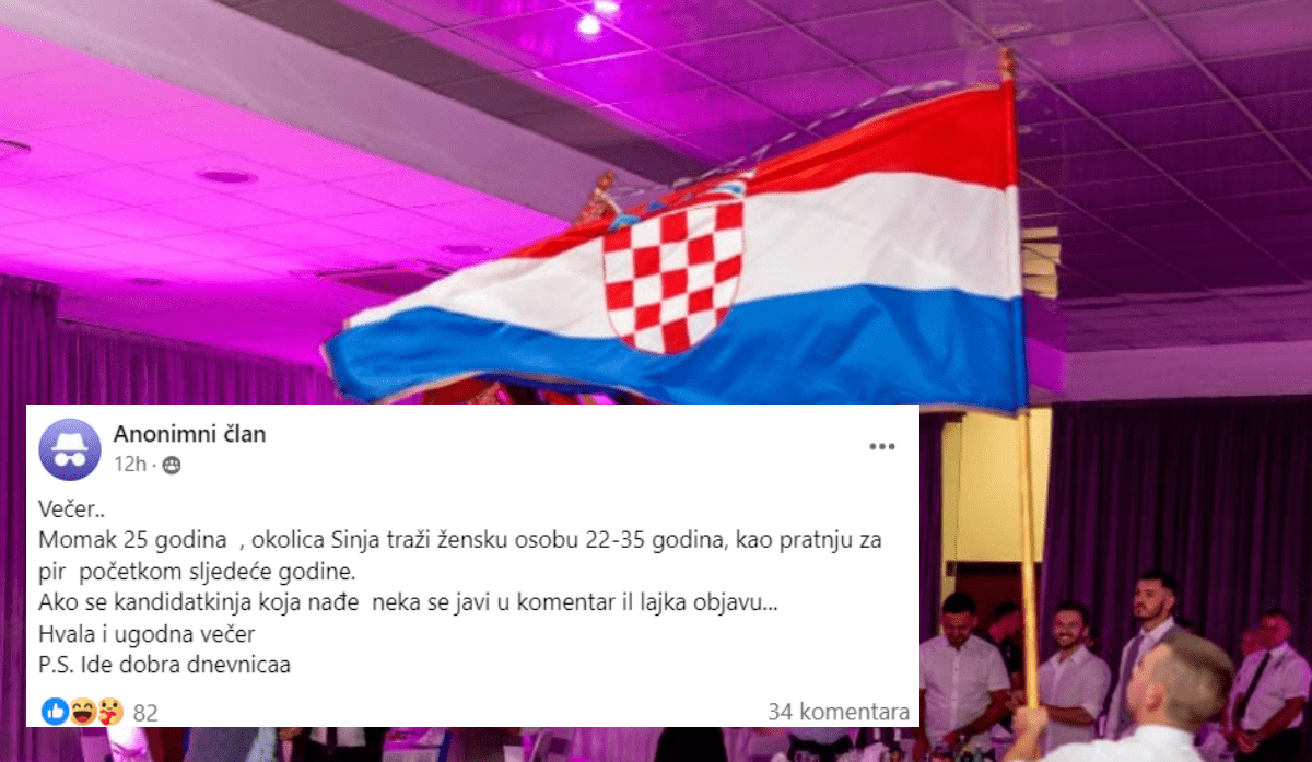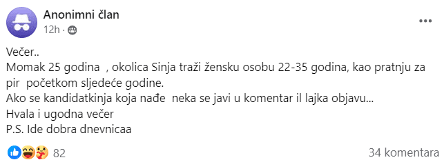 "Večer.. Momak 25 godina, okolica Sinja traži žensku osobu 22-35 godina, kao pratnju za pir početkom sljedeće godine. Ako se kandidatkinja koja nađe neka se javi u komentar il lajka objavu...Hvala i ugodna večer P.S. Ide dobra dnevnicaa", napisao je ovaj nepoznati junak na Facebooku.