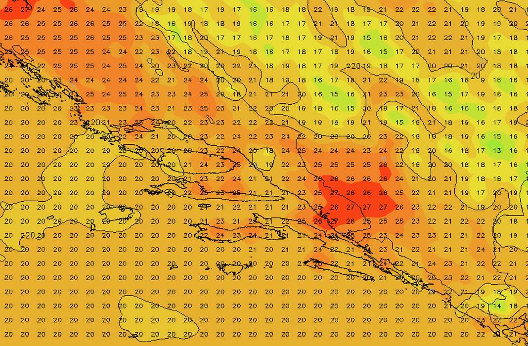 Utorak će u Dalmaciji biti pretežno, a na sjevernom Jadranu djelomično sunčan. Tamo će sunčanije biti u drugom dijelu dana. Na moru će puhati slabo, povremeno i umjereno jugo, prestat će u drugom dijelu dana kada će okrenuti na slab jugozapadnjak ili će biti tiho. Minimalne jutarnje u zaobalju od 7 do 13°C, uz obalu i na otocima od 13 do 18°C. Najviše dnevne temperature većinom od 22 do vrlo toplih 27°C.