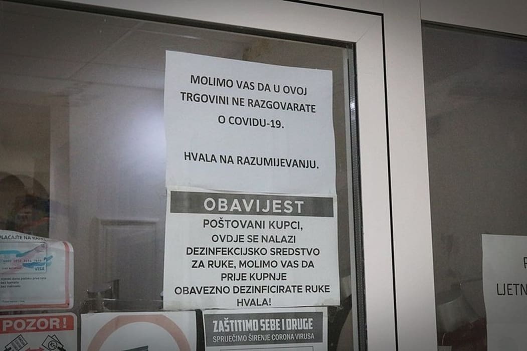 Zanimljiv natpis koji je prije dva mjeseca stavila Dariana Bošković ovih dana je pravi hit na internetu. "Molim vas da u ovoj trgovini ne razgovarate o COVIDU-19. Hvala na razumijevanju", stoji uredno isprintano i zalijepljeno na ulaznim vratima između svih onih uputa koje inače stoje na trgovinama poput radnog vremena i ovih nešto novijih smjernica koje se tiču dezinfekcije i uporabe zaštitnih maski.