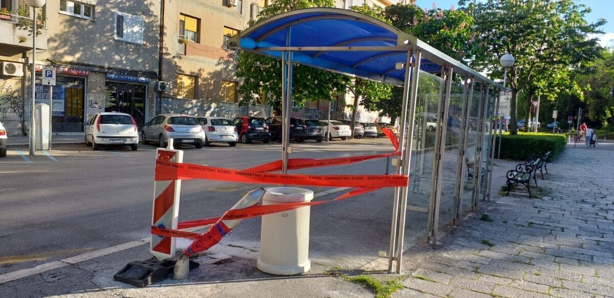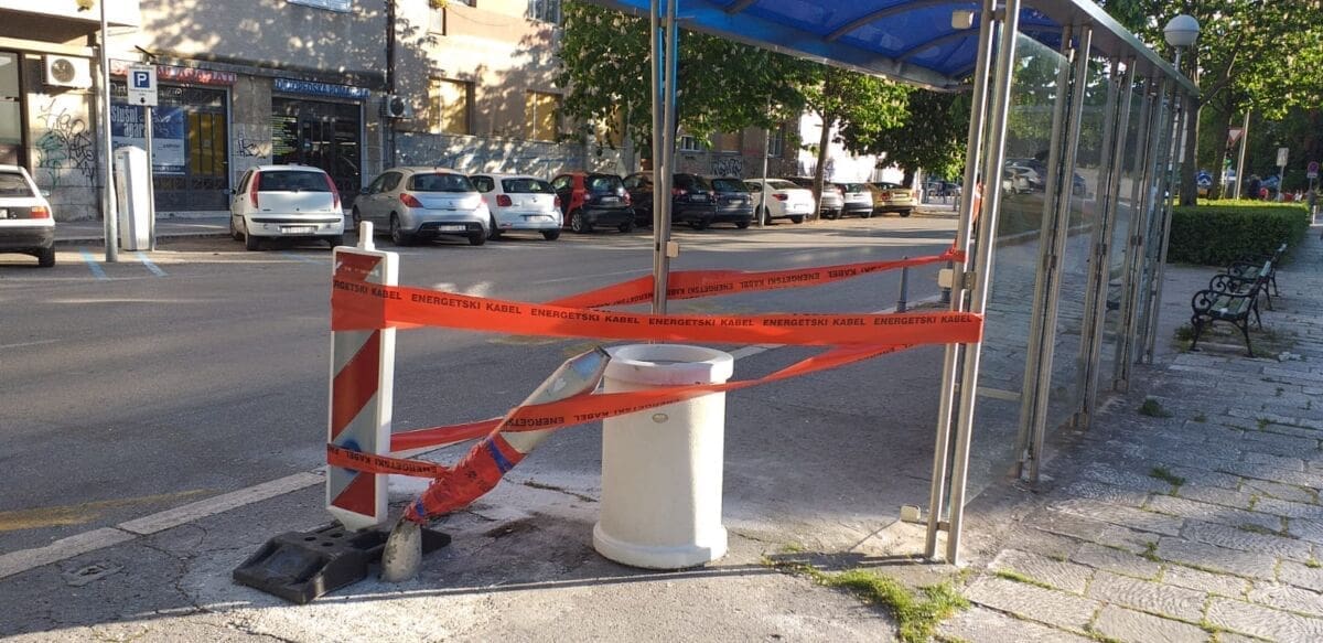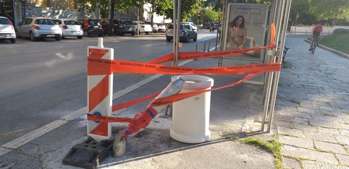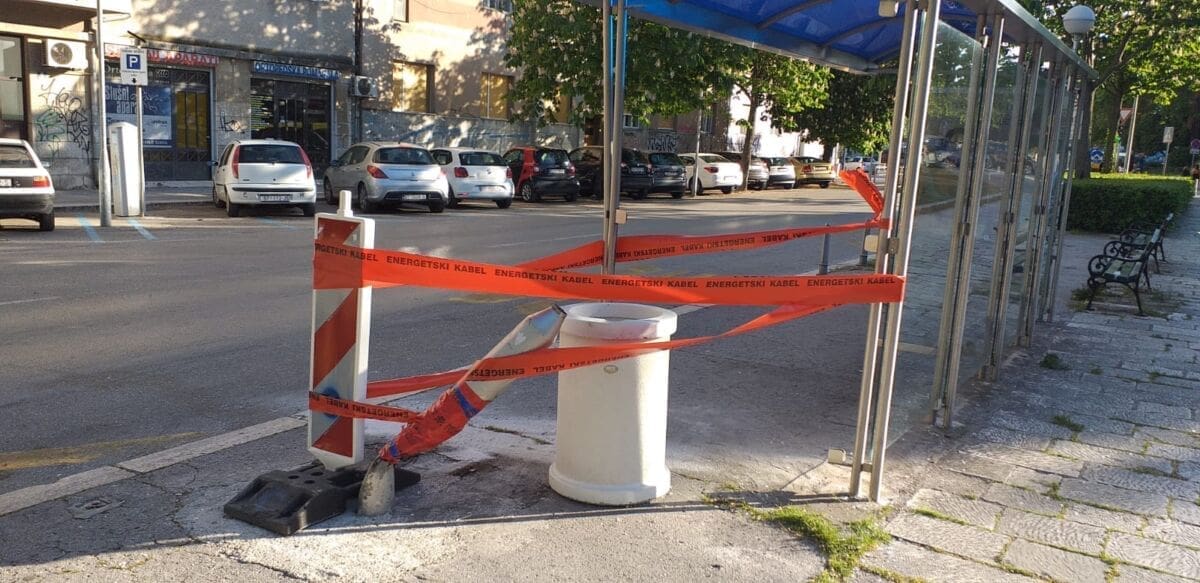 U međuvremenu je veći dio oštećenog stupa uklonjen, ali je postavljena zaštitna traka na kojoj piše "energetski kabel".