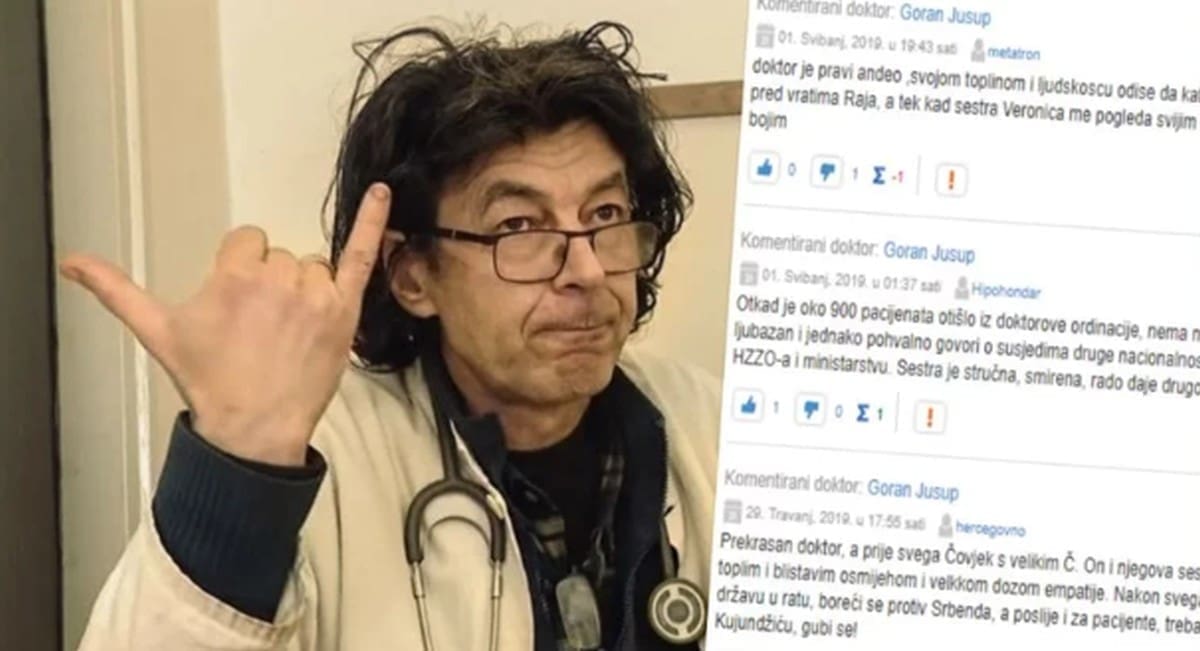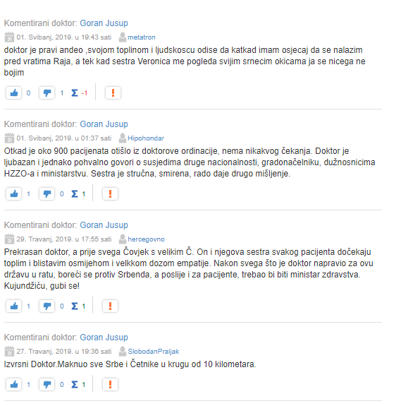 "Ja sam, nažalost, srbenda pa sam samim time zakinut da budem živi svedok dobročinstava ovog doktora. Al ko mi kriv.. Zato mi je komšija Hrvoje pričo da boljeg doktora i čoveka od ovog delije nema. A tek njegova sestra, duša od žene.. Zato ovde dajem sve petice sa nadom da ću se u drugom životu roditi ko Hrvat pa ću i ja moći da se lečim kod ovog divnog čoveka. Također pohvale ministru zdravlja što nije podlego udbaškim pritiscima pa ovog divnog čoveka otero od svog posla.."
