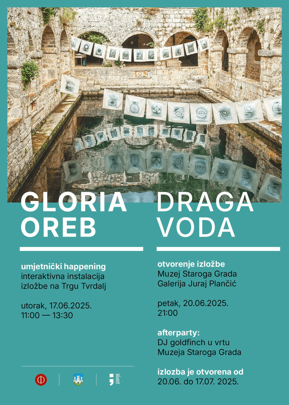 U utorak, 17. lipnja 2025., od 11 do 13:30 sati na Trgu Tvrdalj u Starome Gradu održat će se umjetnički happening i interaktivna instalacija kojom će započeti izložba "Draga voda" renomirane hrvatske slikarice Glorie Oreb. Ovaj vizualno snažan čin u povijesnom srcu grada bit će uvod u multimedijalnu izložbu koja kroz crtež, prostor i vodu progovara o povezanosti čovjeka s prirodom, ali i o memoriji prostora.