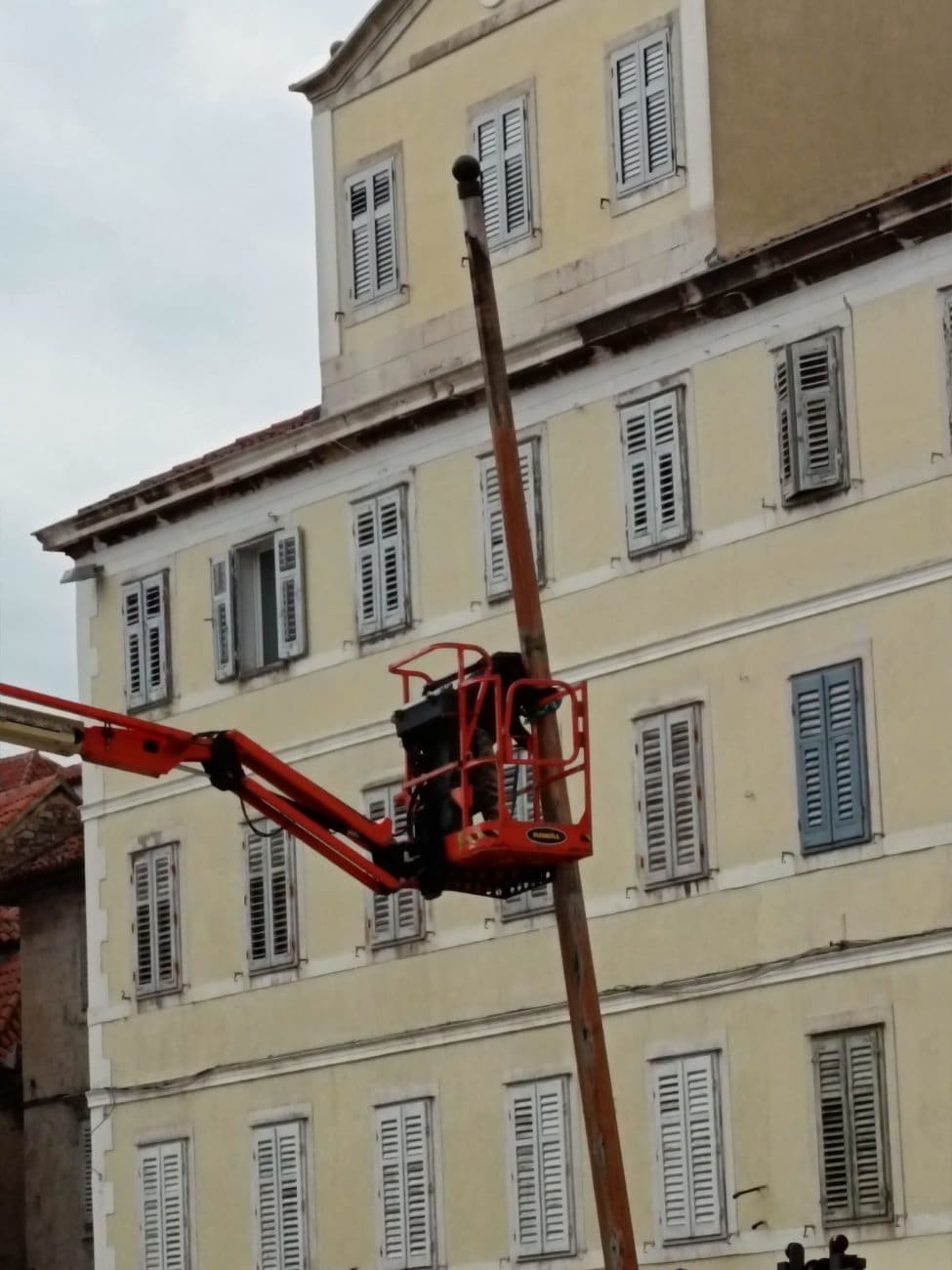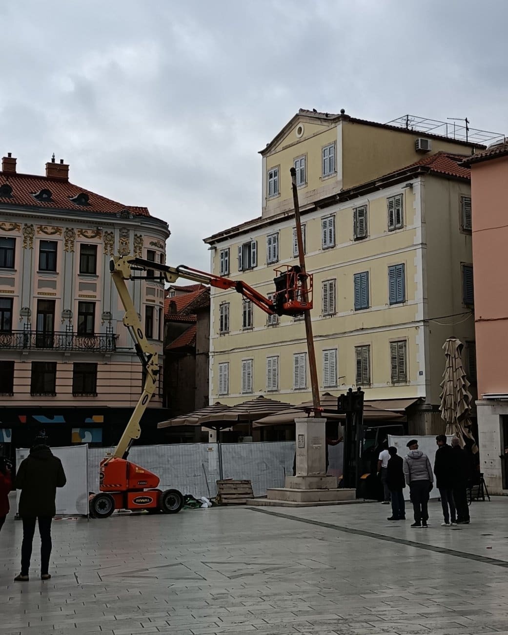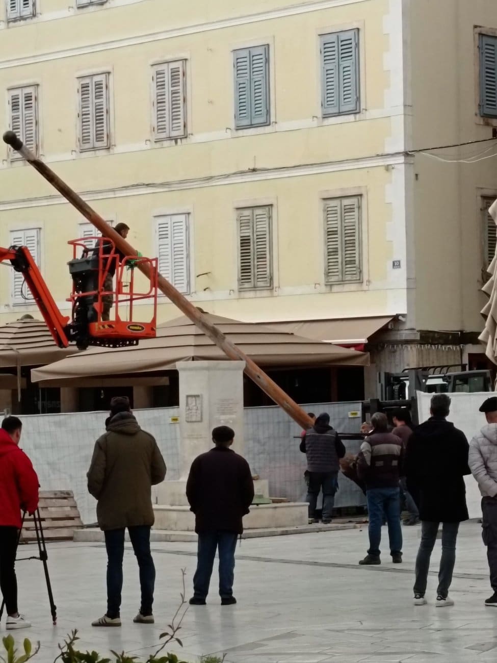 Tek nešto malo nakon što su stavili karnevalsku zastavu na splitski štandarac, stigla je teška mehanizacija na Pjacu i krenula s njegovim uklanjanjem. Na Pjacu je potom stigao i vidno uznemireni kipar i autor štandarca Kuzma Kovačić koji je promptno nazvao policiju. Očevici opisuju kako je sjeo na obližnju klupu, s očajom promatrajući radnike tijekom rušenja njemu iznimno važnog djela.