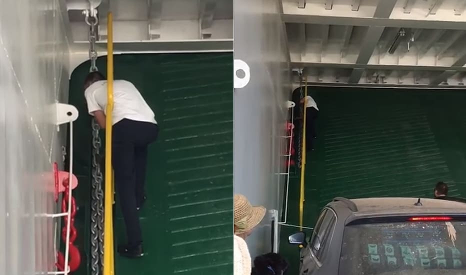 Na snimci se vidi kako jedan muškarac pokušava zaglavljenu rampu pokrenuti udarajući u nju čekićem.