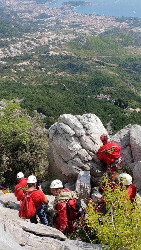 Zbog prirode nastanka ozljede, velike vrućine i vremena potrebnog da se dođe do unesrećenog zatražena je pomoć helikoptera HRZ-a i letača spašavatelja. U skladu s doktrinom HGSS–a, na teren je u roku 20 minuta izišla zemaljska ekipa sastavljena od 11 spašavatelja HGSS stanice Makarska. Dolaskom na stijenu gdje se nalazi izlaz iz smjera spašavatelji pripremaju sidrište i spuštaju se prema penjačima. Dolazi i letački dio ekipe sastavljene od posade helikoptera MI-8 MTV Hrvatskog ratnog zrakoplovstva i četiri spašavatelja letača koji su stacionirani u Splitu na ljetnom dežurstvu.