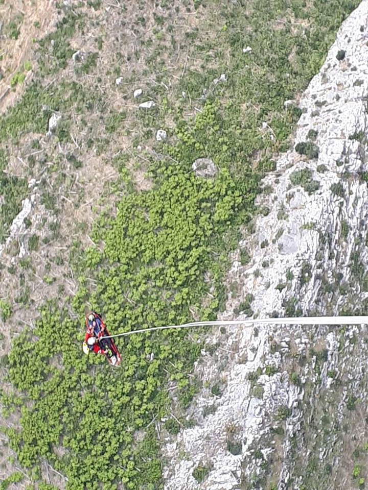 Helikopter dolazi u 16,50 sati iznad ekipe u stijeni i na 50 metarskom užetu u podvjesu izvlači unesrećenog u pratnji letača spašavatelja i transportira u Bašku Vodu gdje ga spušta na nogometni teren i ukrcava u helikopter. Unesrećeni je transportiran u Split i na heliodromu Firule predan medicinskoj ekipi Kliničkog bolničkog centra.