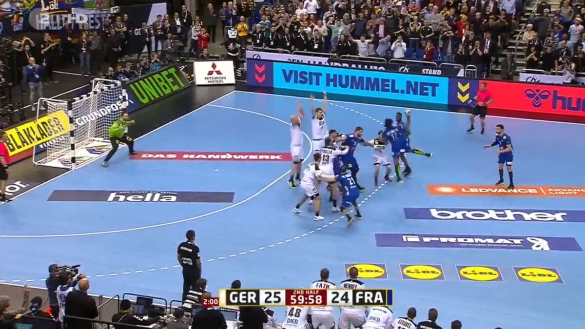 Do izjednačenja je došlo kada je Bohm tri sekunde prije kraja napravio prekršaj za devet metara i isključenje. Nije ni tada izgledalo da će Francuzi izjednačiti, ali je N'Guessan, koji je pola minute ranije izgubio loptu, preko živog zida Njemačke zabio za konačnih 25:25.