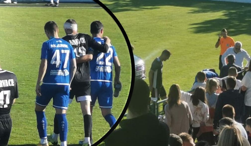 Domaći igrač Dominik Plavša udario je glavom o ogradu uz rub igrališta te je krvave glave ostao ležati, prenosi Dalmatinski nogomet.