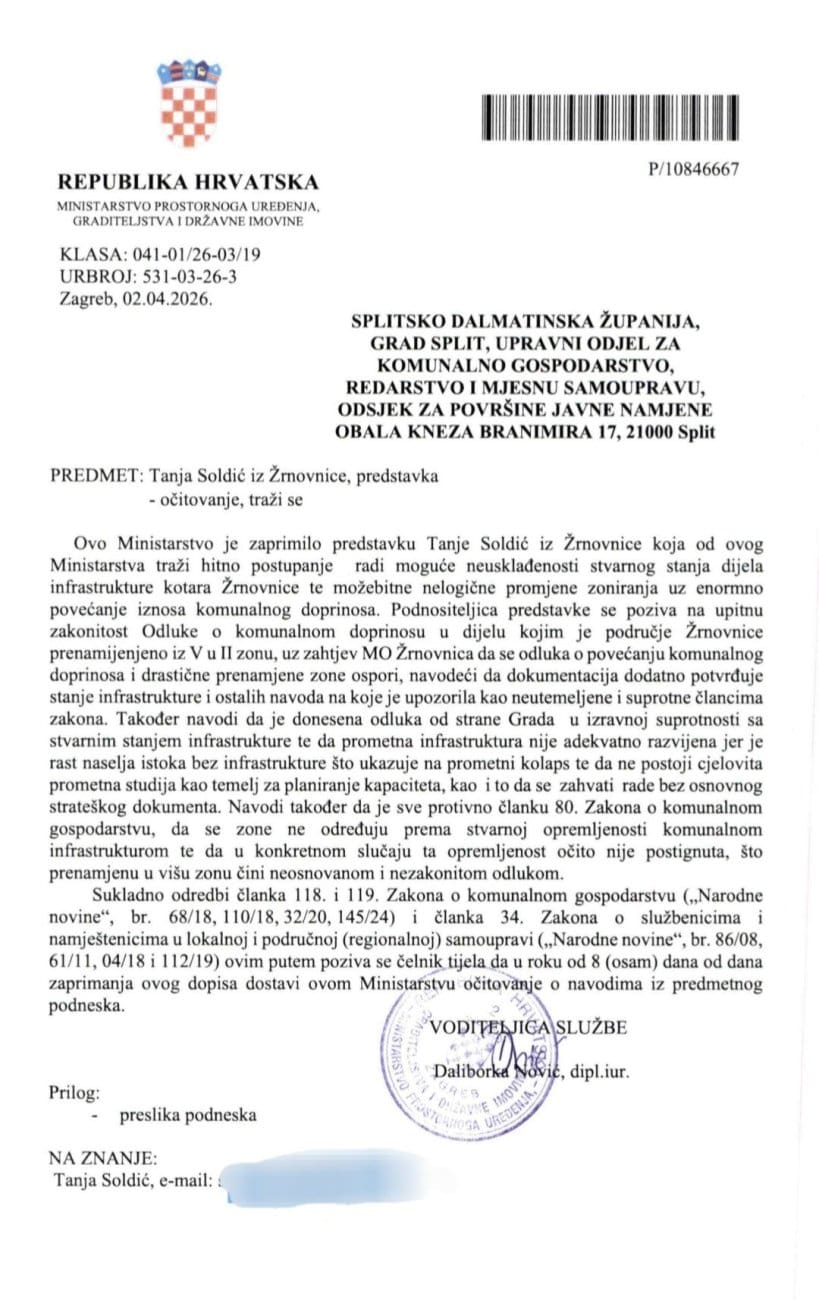 Nakon što je Mjesni odbor Žrnovnica upozorio na naglo povećanje komunalnog doprinosa zbog prenamjene područja iz V. u II. zonu, reagiralo je i Ministarstvo prostornoga uređenja, graditeljstva i državne imovine, koje je zatražilo očitovanje Grada Splita.