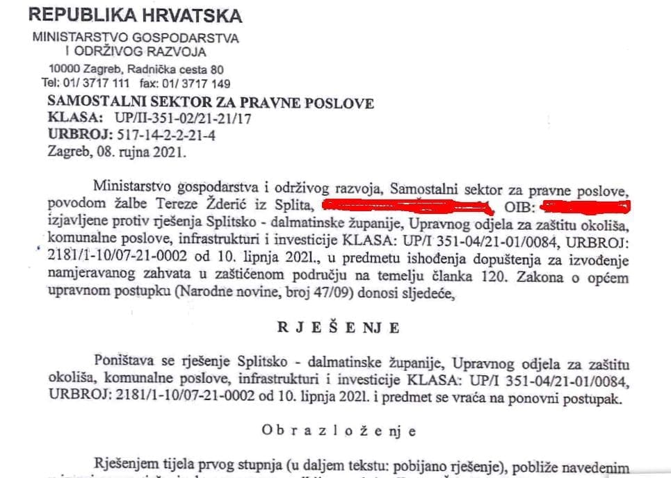 Grad Split je izdao dva oprečna mišljenja o uvjetno rečeno statusu gradnje investitorice Tereze Žderić u uvali Ježinac. Posljednje je ono Tea Vojkovića koji smatra da projektant i investitor u svom postupanju nisu postupili sukladno odredbama prostorno – planske dokumentacije, zakona, pravilnika i posebnih propisa, tj. da Glavni projekt mora sadržavati potvrde javnopravnih tijela propisane posebnim propisima, onima o zaštiti prirode. Kako to komentirate?