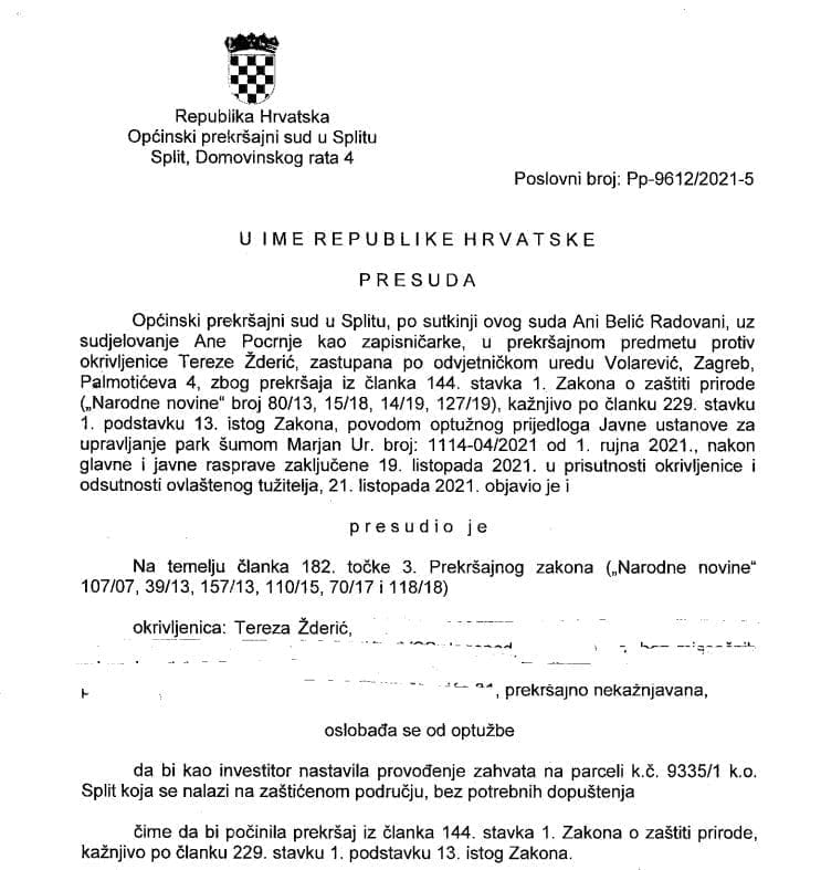 Javna ustavnova za upravljanje Park-šumom Marjan je podnijela Optužni prijedlog protiv investitorice radi navodnog počinjenja prekršaja jer stalno guraju tu neistinu da je njoj, koja već ima odgovarajući akt za gradnju, potrebno i dodatno dopuštenje. Općinski prekršajni sud u Splitu je proveo detaljan postupak i sasvim oslobodio investitoricu od ovakve klevete, dakle, oslobodio je optužbe za prekršaj jer ista – ima sve potrebne dozvole za izvođenje ovog zahvata. Sud je u postupku čak utvrdio da investitorica ima i više dokumentacije nego što je propisano za ovakav zahvat. Pitate se onda - tko je tu lud?