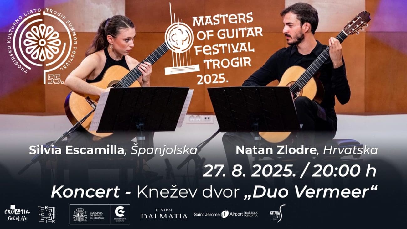 Večeras, s početkom u 20:00 sati, u atriju Kneževa dvora održat će se druga večer festivala Majstori gitare, na kojoj će nastupiti međunarodno priznati Duo Vermeer, gitaristički duo osnovan 2022. godine u Haagu. Duo čine gitaristica Silvija Escamilla (Španjolska) i gitarist Natan Zlodre (Hrvatska), glazbenici s bogatim koncertnim iskustvom i dobitnici brojnih međunarodnih nagrada i priznanja.