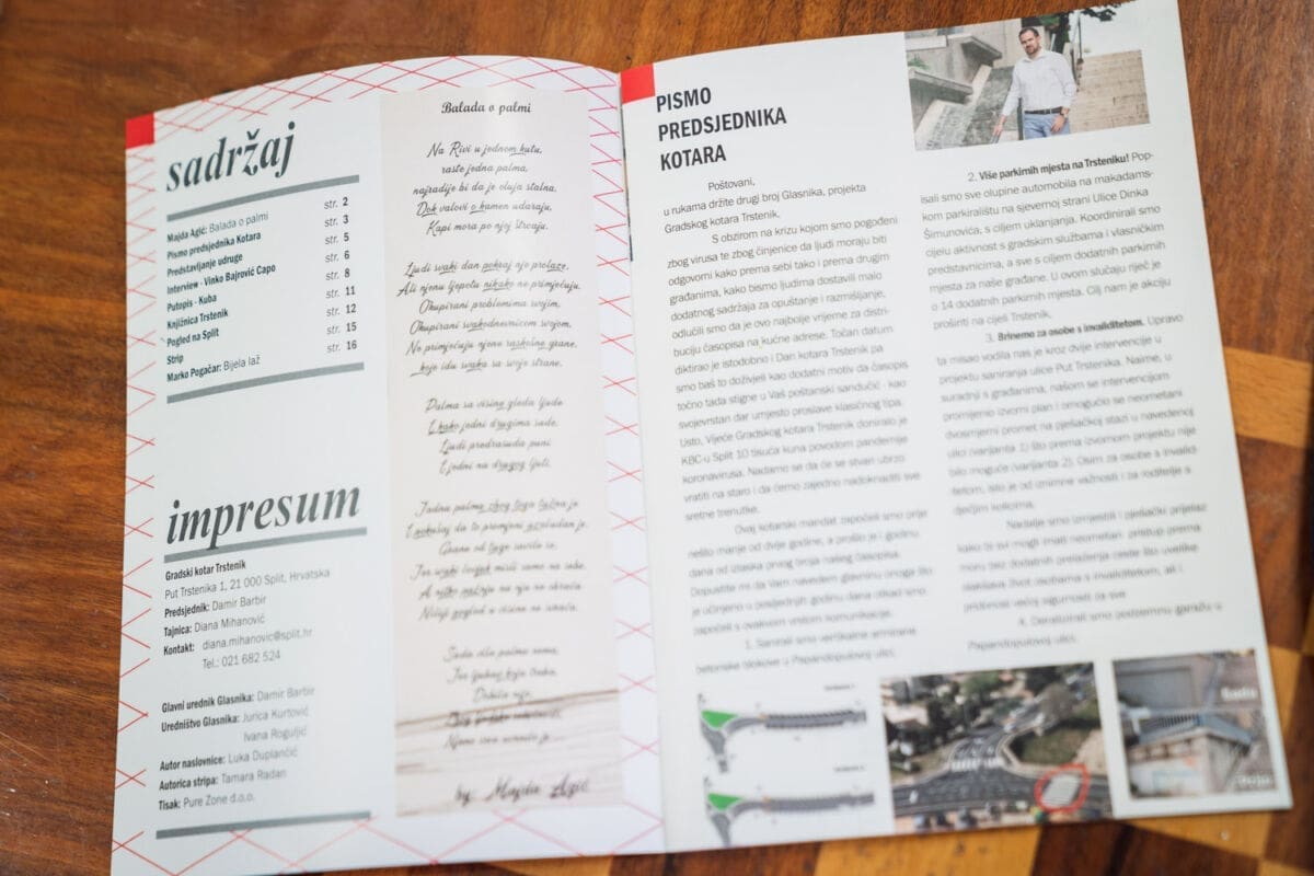 - Što se tiče sadržaja, u Glasniku su razne teme, zajedničko im je da svaka ima poveznicu s kotarom. Od putopisa na Kubi kojeg sam napisao, preko kvartovskog stripa i promocije 20 godina knjižnice Trstenik do intervjua s poznatim ljudima što je u ovom broju prof. Vinko Bajrović, koji u kvartu besplatno daje repeticije te pripreme za mature i tako pokazuje socijalnu notu. U Glasniku je i pregled događaja od prošlog broja, što se sve događalo, kakve su sve promjene nastupile u kvartu od zadnjeg puta. Za kotarski Glasnik pišu umjetnici koji su tu odrasli Majda Agić i Marko Pogačar, a cijeli projekt koji traje dvije godine urednički obrađujemo Jurica Kurtović, Ivana Roguljić i ja. - pojasnio je Barbir.