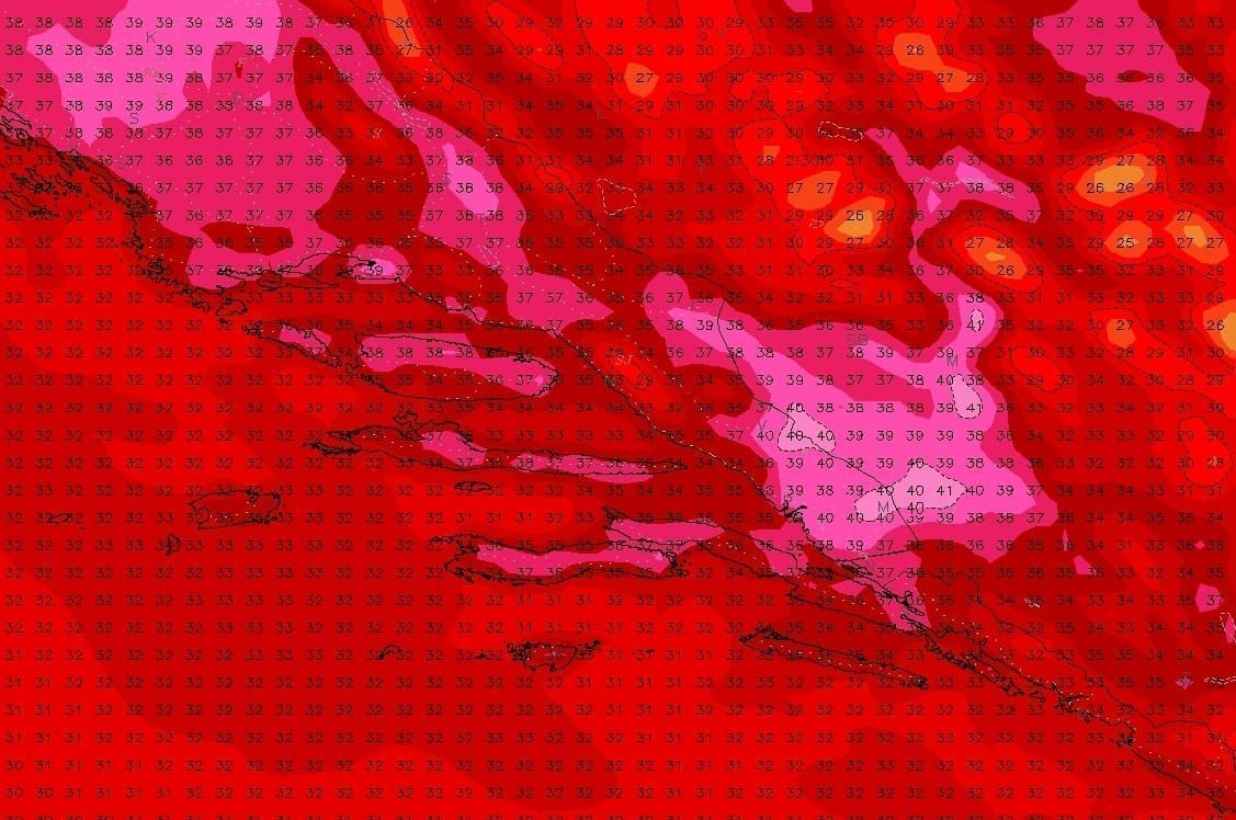 Srijeda će biti pretežno sunčana. Popodne je tek ponegdje u Dalmatinskoj zagori moguć umjeren razvoj oblaka. Noću tiho ili burin, danju će puhati slab maestral. Od jutra još toplije, u najtoplijem dijelu dana većinom od 33 do 40°C.