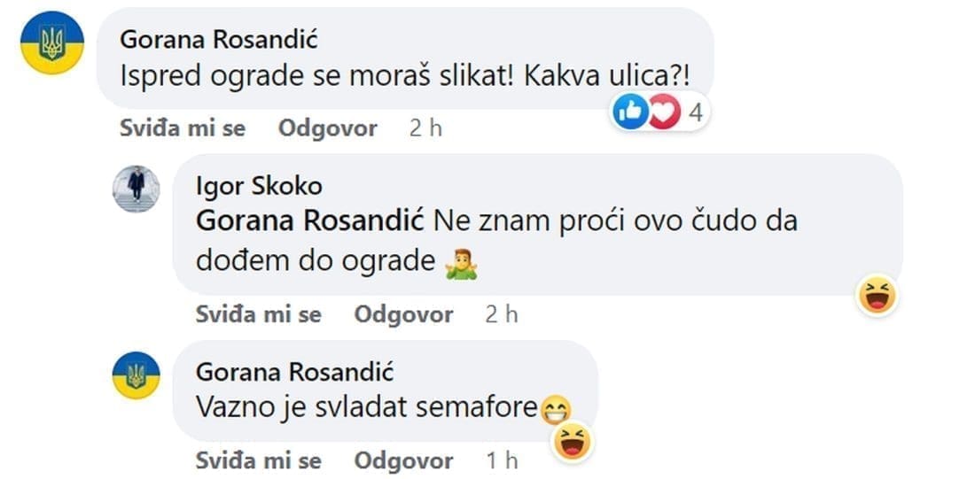 "Ispred ograde se moraš slikati! Kakva ulica?!", napisala mu je u komentaru Gorana Rosandić, županijska vijećnica "Centra" u Splitsko-dalmatinskoj županiji. Skoko joj je u šali odgovorio da ne zna proći 'ovo čudo' da dođe do ograde koju je spomenula.
