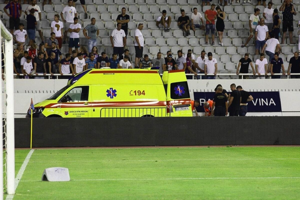 Oko 22 sata jedan je muškarac s tribine bacio nepoznati predmet prema zaštitaru i fotoreporteru, pri čemu je izgubio ravnotežu i pao u međuprostor tribine, te je lakše ozlijeđen.