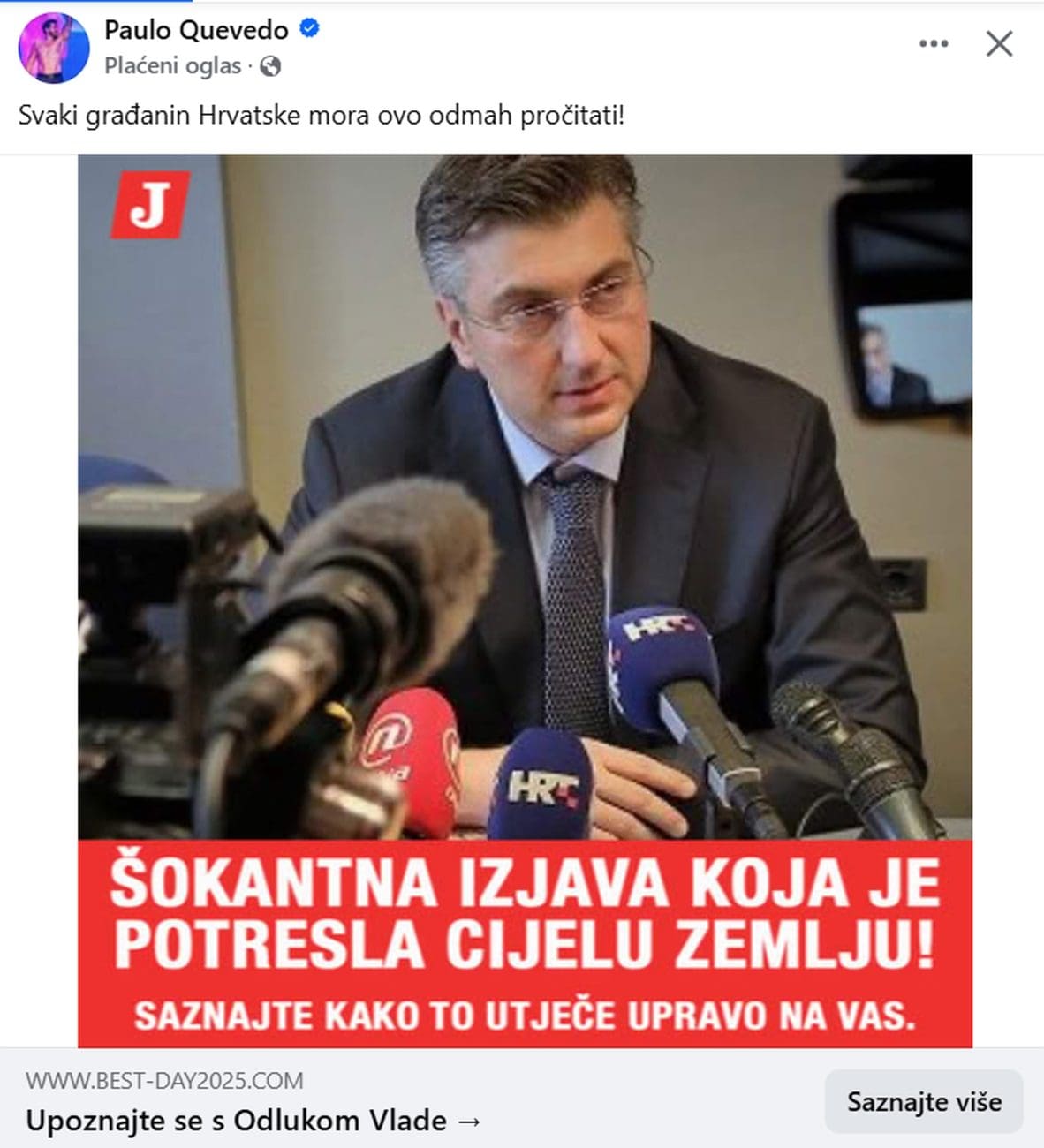 Oglas sadrži fotografiju hrvatskog premijera Andrej Plenković, uz logo Jutarnjeg lista i privlačan, senzacionalistički naslov koji sugerira da se radi o važnoj i šokantnoj informaciji. Korisnici koji kliknu na oglas preusmjeravaju se na nepoznatu i sumnjivu domenu, primjerice "www.best-day2025.com", koja nije povezana ni s jednom legitimnom institucijom, medijem ili državnim tijelom.