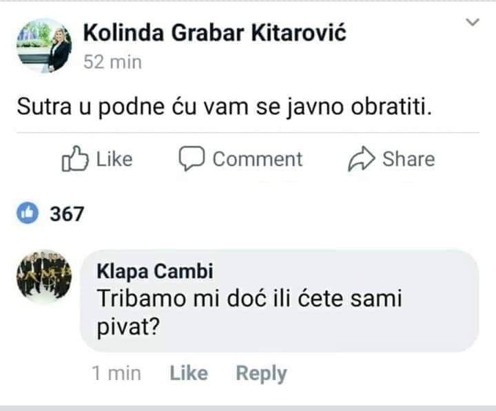 Ovaj se screenshot brzinom munje proširio društvenim mrežama, no niti se radi o stvarnom statusu predsjednice niti o stvarnom komentaru klape Cambi. Netko se očito našalio, a jedna je istina da predsjednica u 12 sati objavljuje svoju kandidaturu.