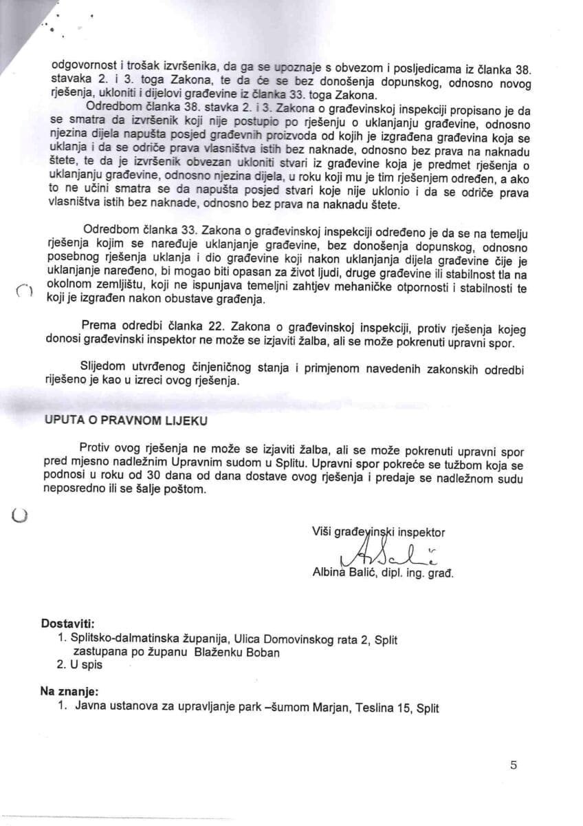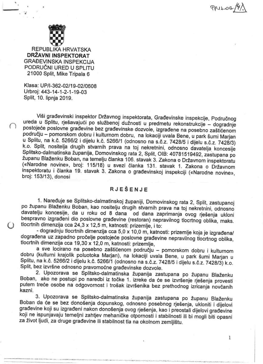 Državni inspektorat u lipnju ove godine donio je rješenje kojim se županu Blaženku Bobanu naređuje da u roku od 8 dana ukloni bespravno izgrađeni dio restorana na Benama. Unatoč tome, poslovanje koncesionara i u tom bespravno izgrađenom dijelu restorana i dalje se nesmetano nastavlja bez pokretanja postupka uklanjanja i bez raskida ugovora o koncesiji te postoji osnovana sumnja da je župan Blaženko Boban kao odgovorna osoba Županije zlouporabio svoj položaj i ovlasti omogućivši pribavljanje koristi koncesionaru daljnjim obavljanjem djelatnosti u dokazano nezakonito dograđenoj poslovnoj građevini. Obavljanje takve nezakonite djelatnosti uz blagoslov i „neznanje” Županije traje već više od 10 godina.