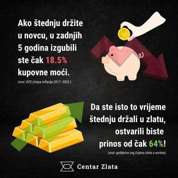 U situaciji u kojoj novac vrijedi sve manje, zbog čega nije pogodan za dugoročnu štednju, štediše u svijetu, ali i u Hrvatskoj, sve se više okreću drugim, isplativijim oblicima štednje otpornim na inflaciju. Najpopularniji takav oblik štednje je ulaganje u investicijsko zlato - zlatnike i zlatne poluge u fizičkom obliku koji su tradicionalni način očuvanja vrijednosti u dugom roku. Glavni razlog zbog kojega štediše ulažu u zlato jest visok prinos kojeg takva vrsta štednje donosi.